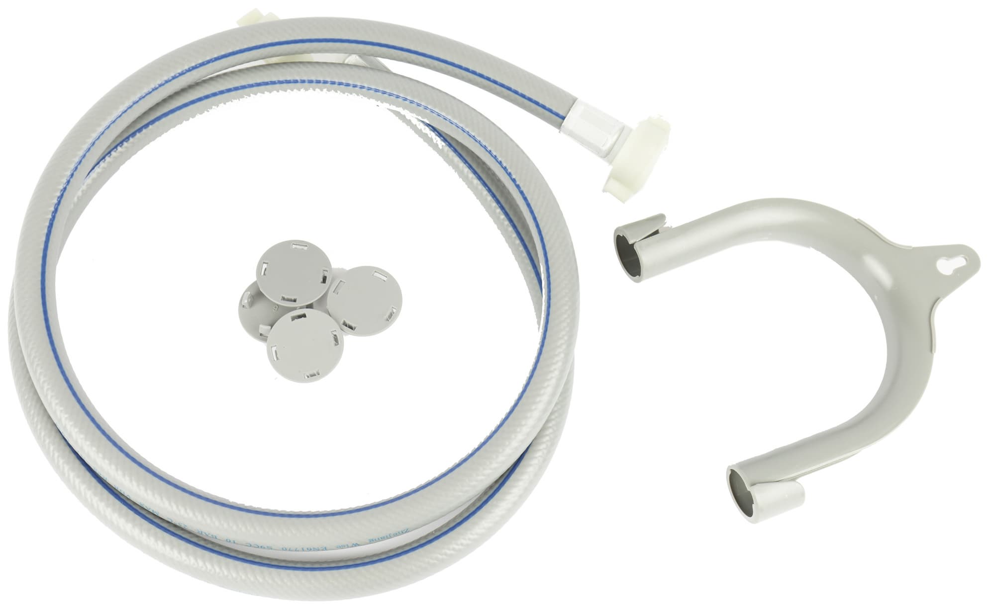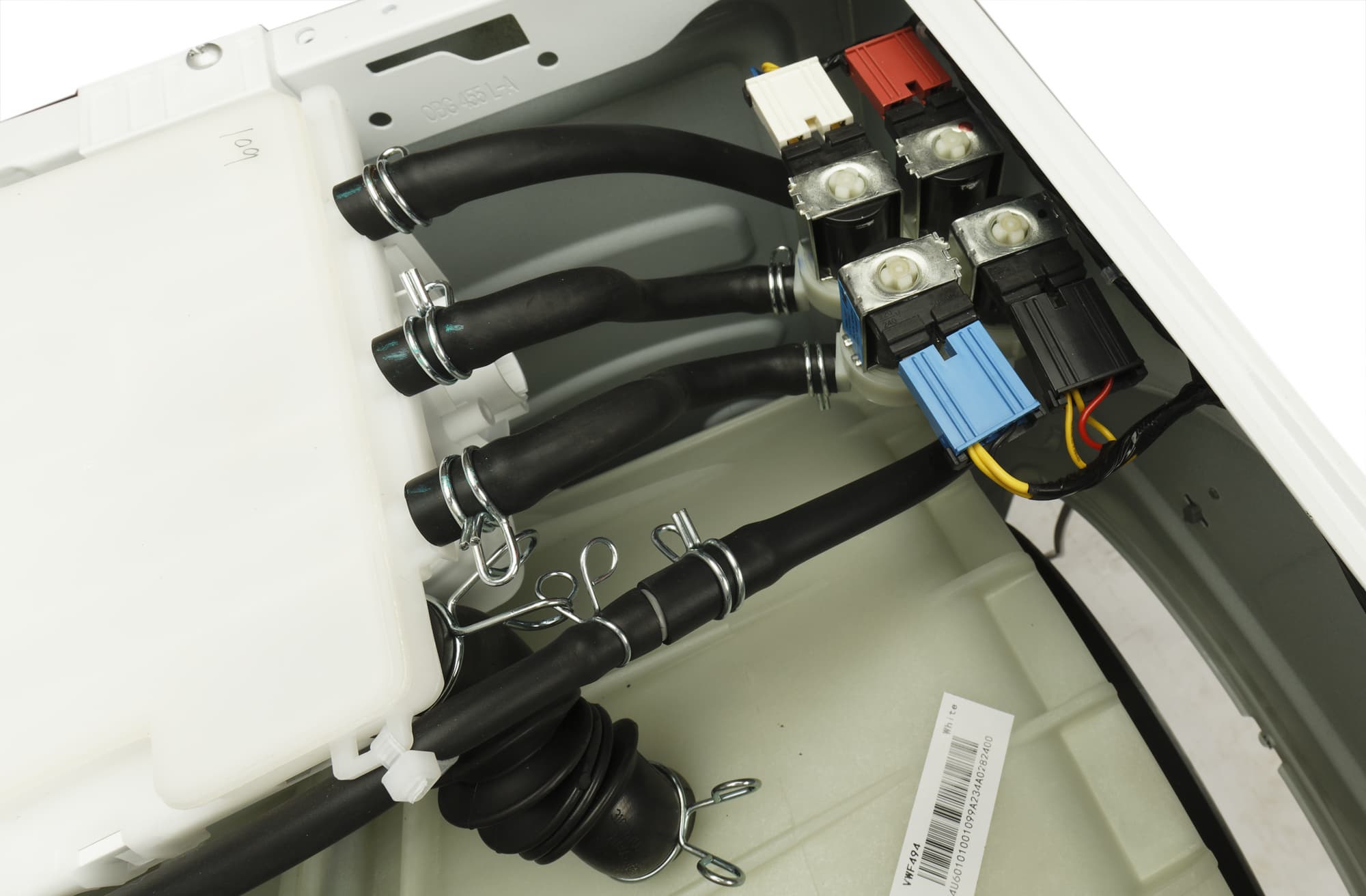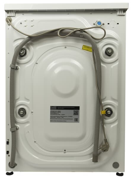 Освободив устройство от упаковки, мы обнаружили внутри саму стиралку с несъемным сливным шлангом, заливной шланг традиционной конструкции, кронштейн для слива, комплект заглушек для отверстий транспортировочных винтов, руководство пользователя и наклейку с информацией об энергоэффективности устройства.