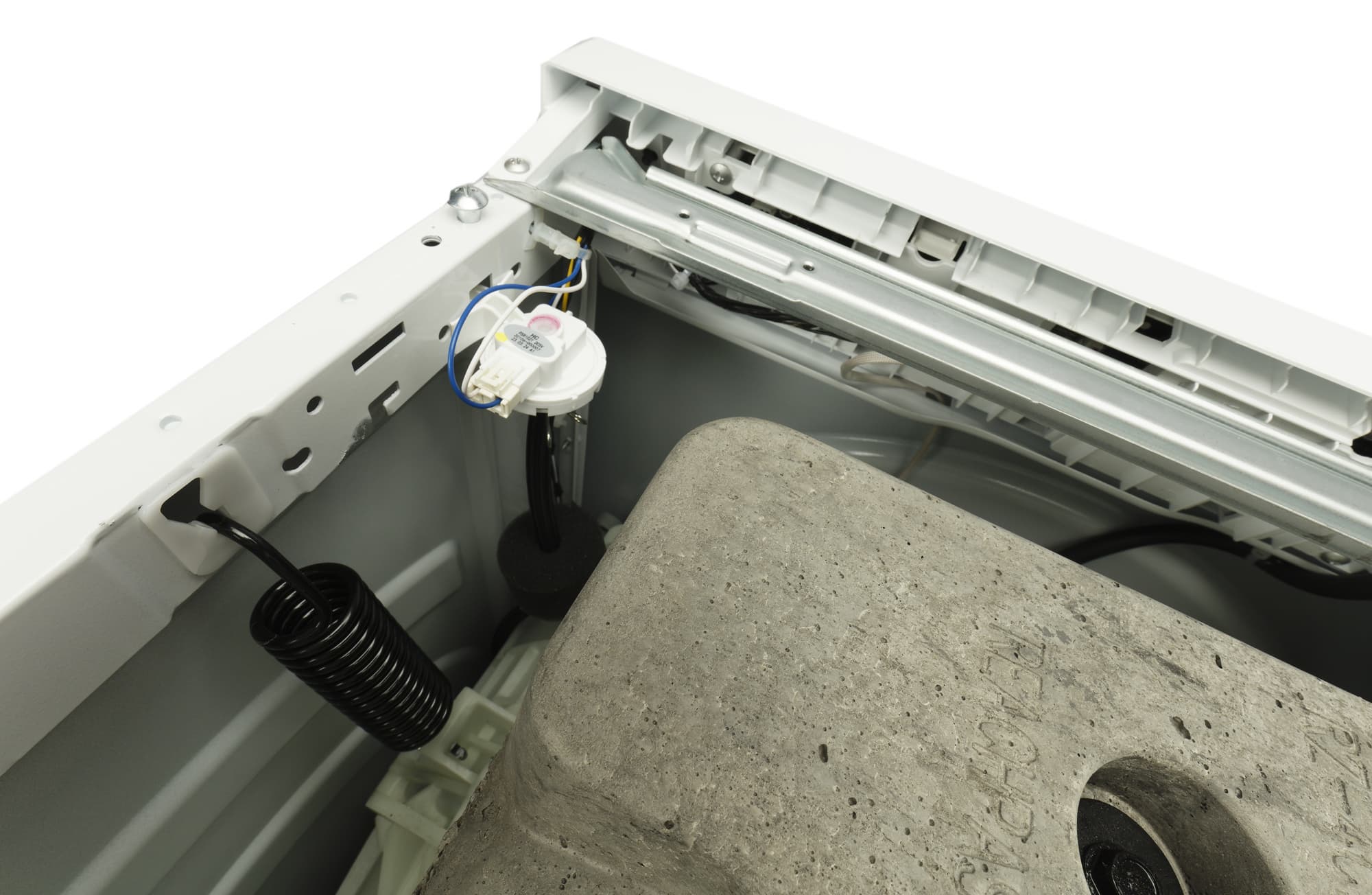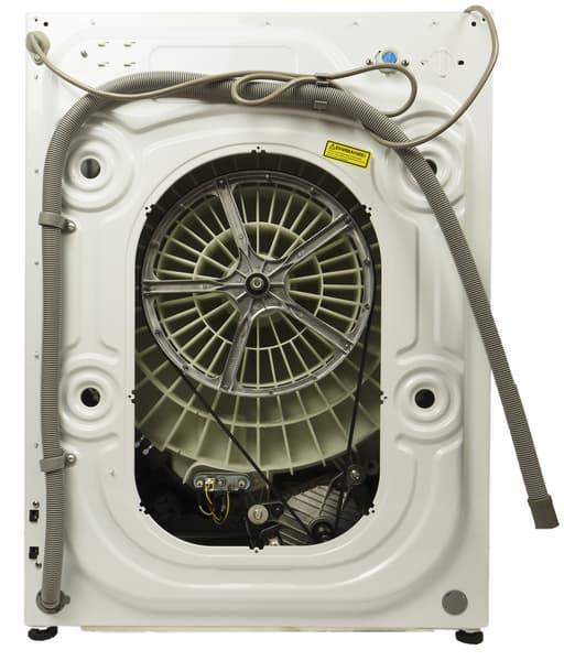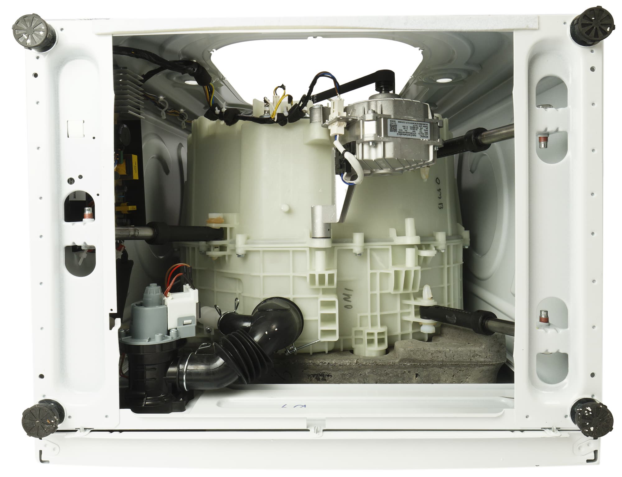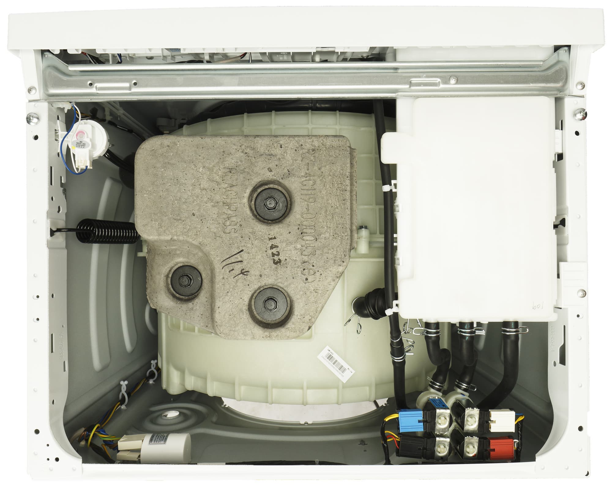 Как обычно, при знакомстве с новой стиральной машиной мы проводим ее неполную разборку, снимая верхнюю пластиковую панель и заднюю крышку, и фотографируем агрегат изнутри.