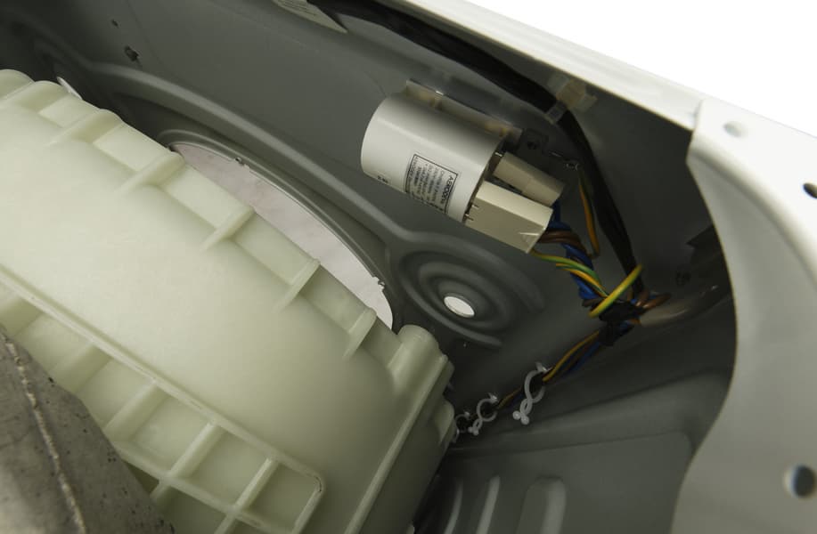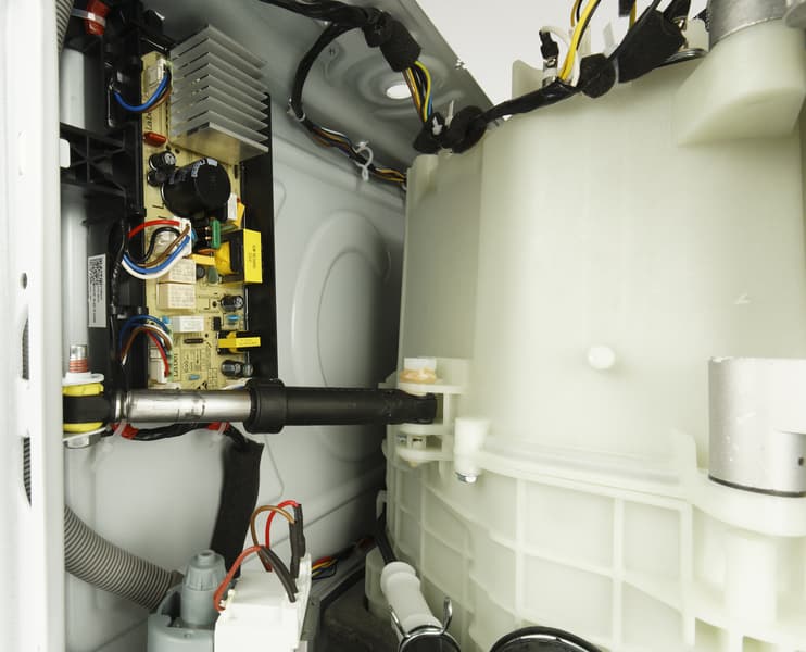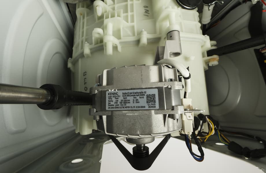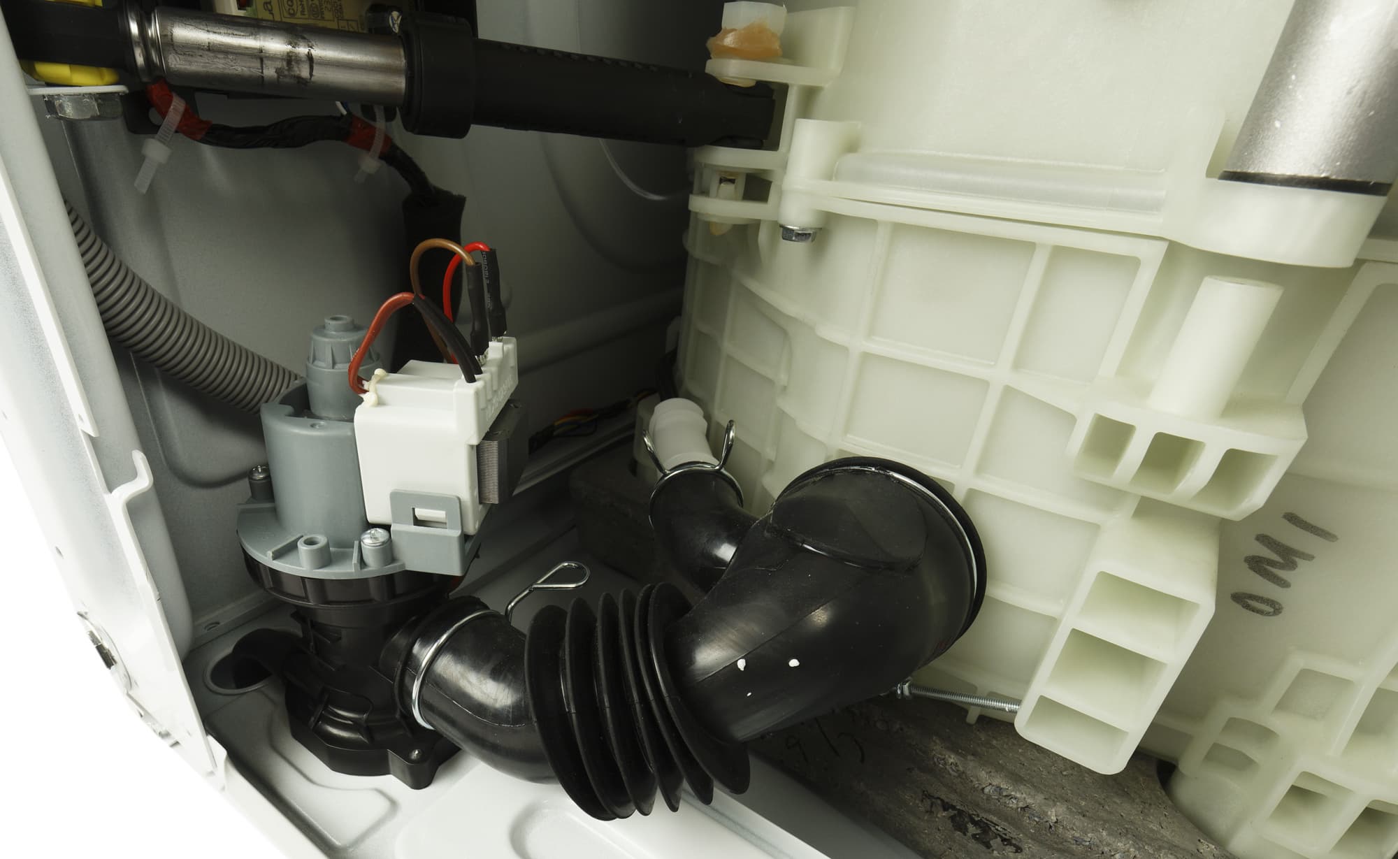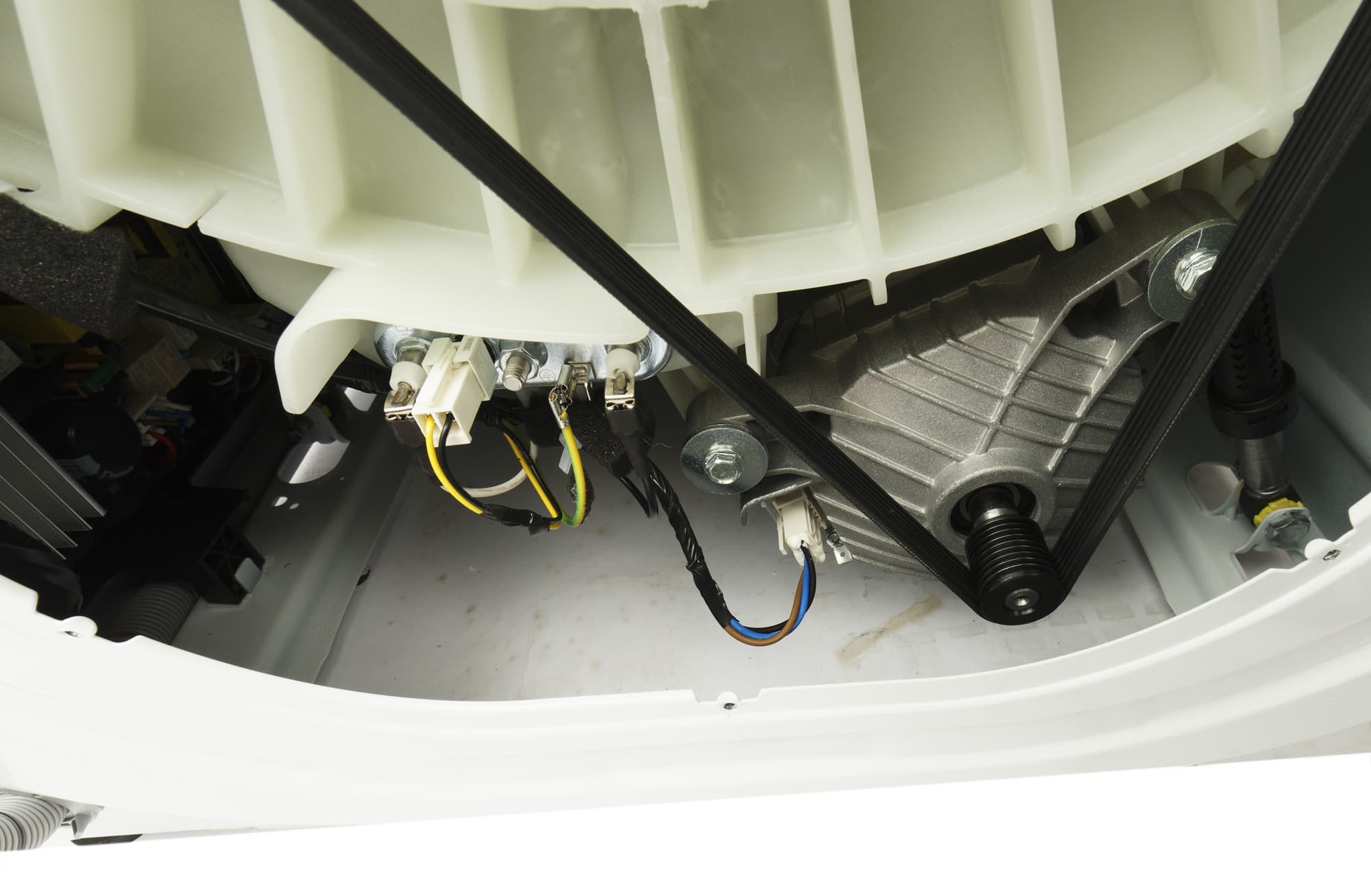Как обычно, при знакомстве с новой стиральной машиной мы проводим ее неполную разборку, снимая верхнюю пластиковую панель и заднюю крышку, и фотографируем агрегат изнутри.