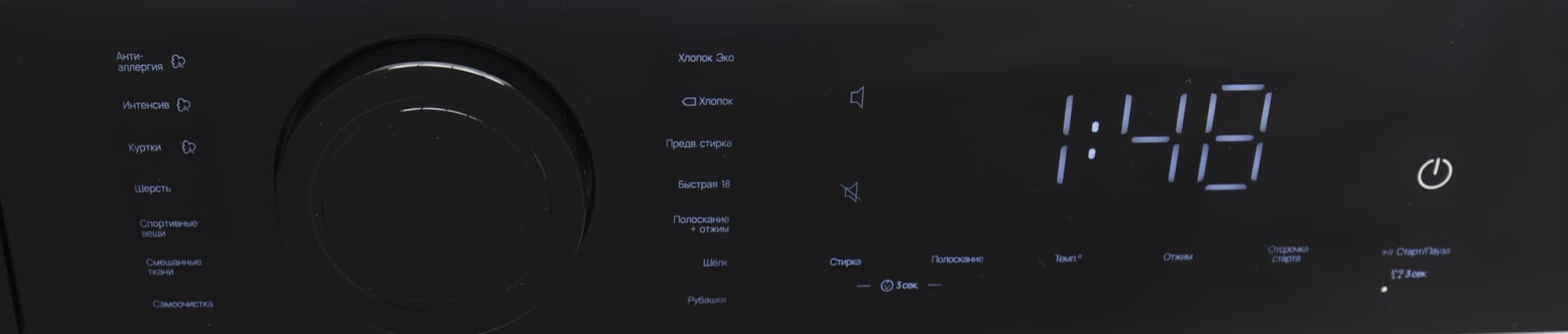 Как это часто бывает у современных стиралок, пользователь задает программы и другие параметры стирки с помощью круглого селектора программ и дисплея с сенсорными кнопками и светодиодной индикацией (не видна, если стиралка выключена). Чтобы прибор заработал, надо нажать «Power» в правом нижнем углу.