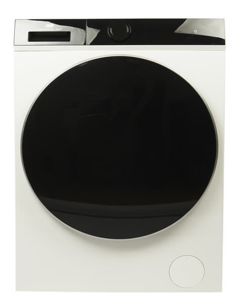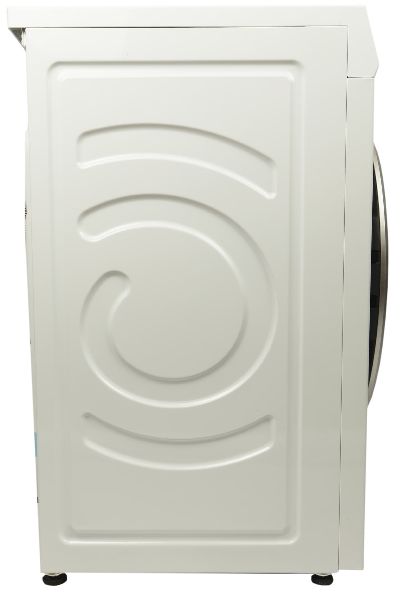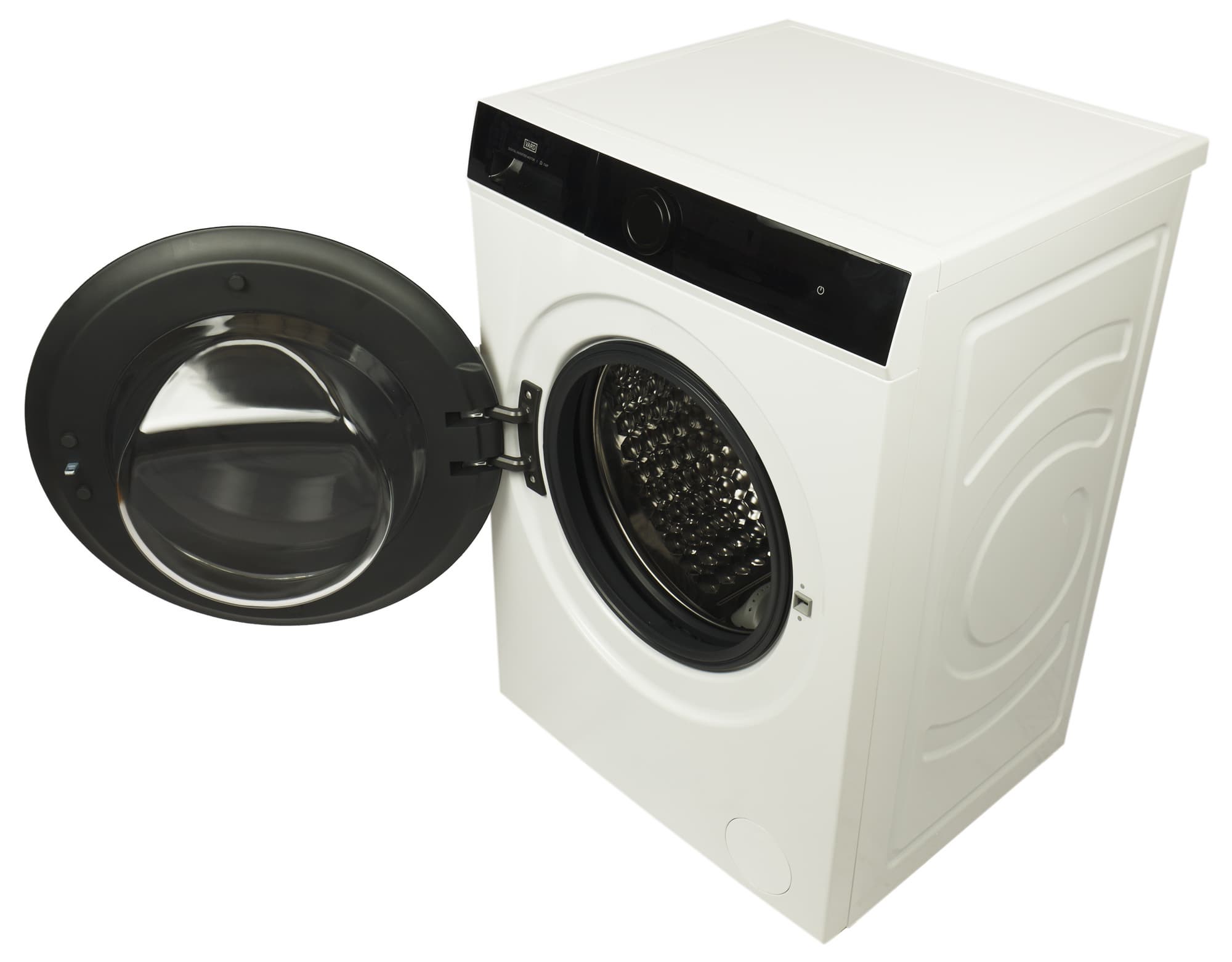 Белый корпус стиральной машины контрастирует с черной глянцевой панелью управления и крышкой люка, украшенной колпаком из гладкого темного пластика.