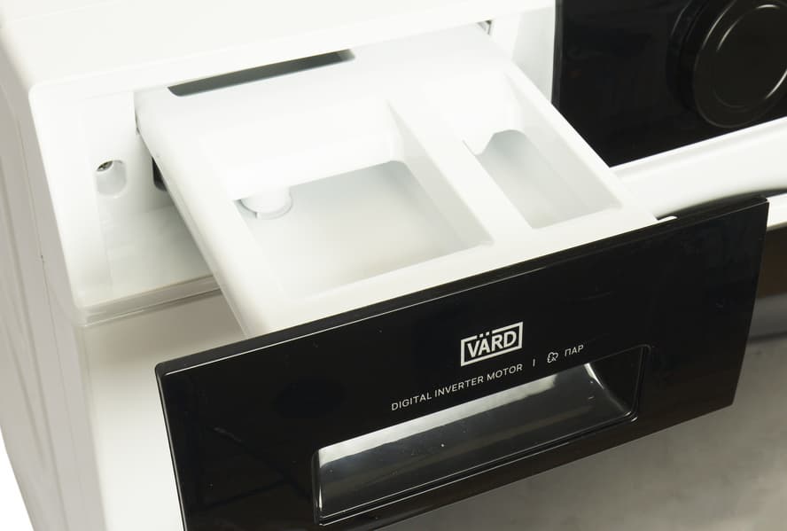 Лоток для моющих средств расположен в верхнем левом углу передней панели. Как и у большинства стиральных машин, в емкости три отделения: справа место для кондиционера, а слева — отсеки для основной и предварительной стирок. Ванночка для предварительной стирки размещена ближе к пользователю, и это не кажется логичным: при обычном использовании она используется реже, чем емкость для основной программы.