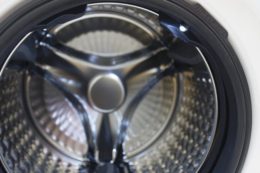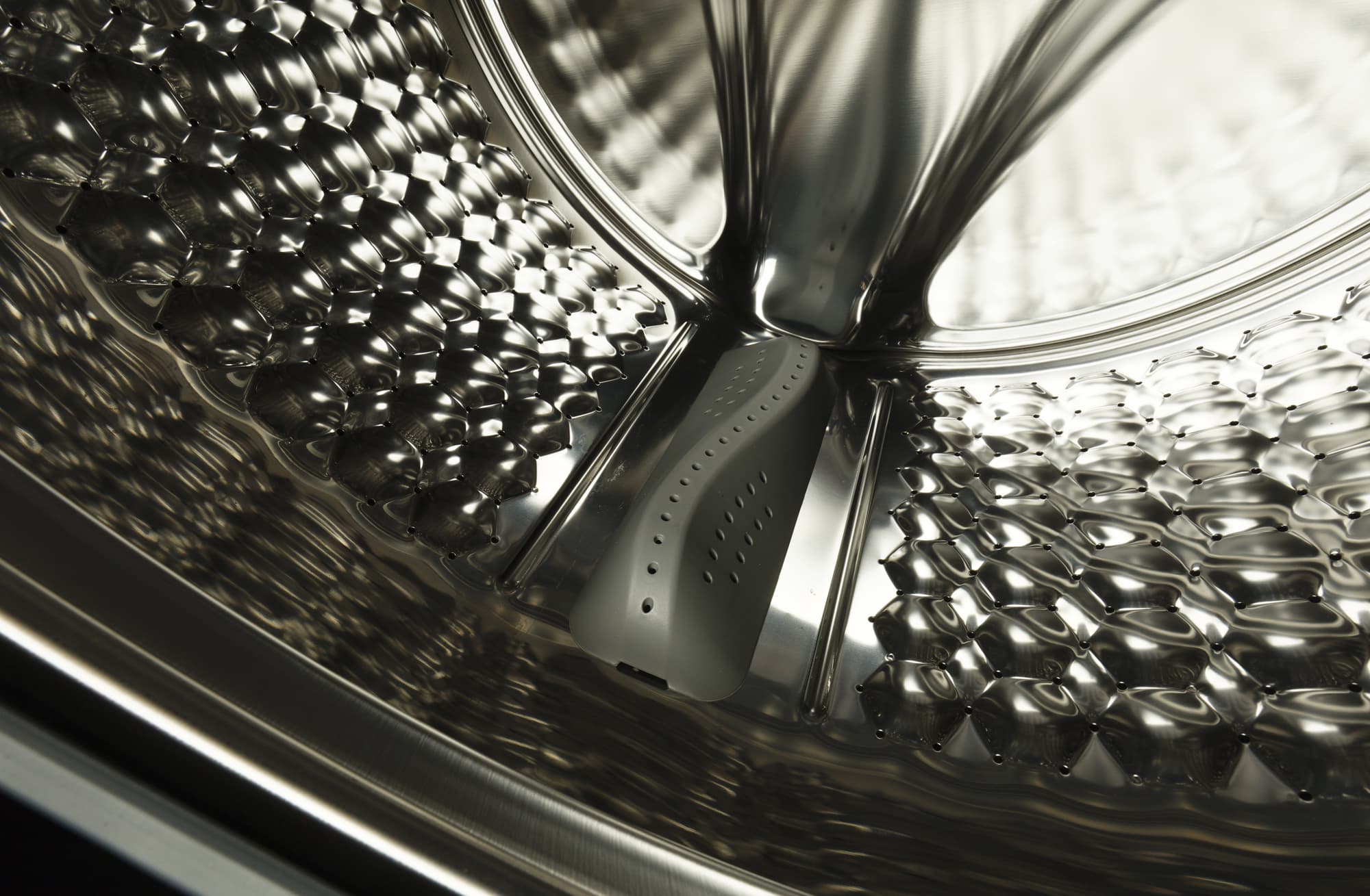 На внутреннюю поверхность барабана нанесены выпуклые шестиугольники, в углах которых — отверстия для циркуляции воды. Плавно изогнутые пластиковые бойники — также с отверстиями.