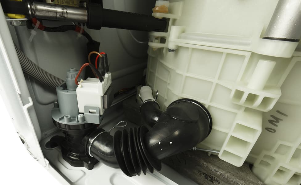 Осталось только подключить стиральную машину к коммуникациям — и она готова к работе. Заливной шланг к водорозетке, сливной в канализацию — перепутать трудно.