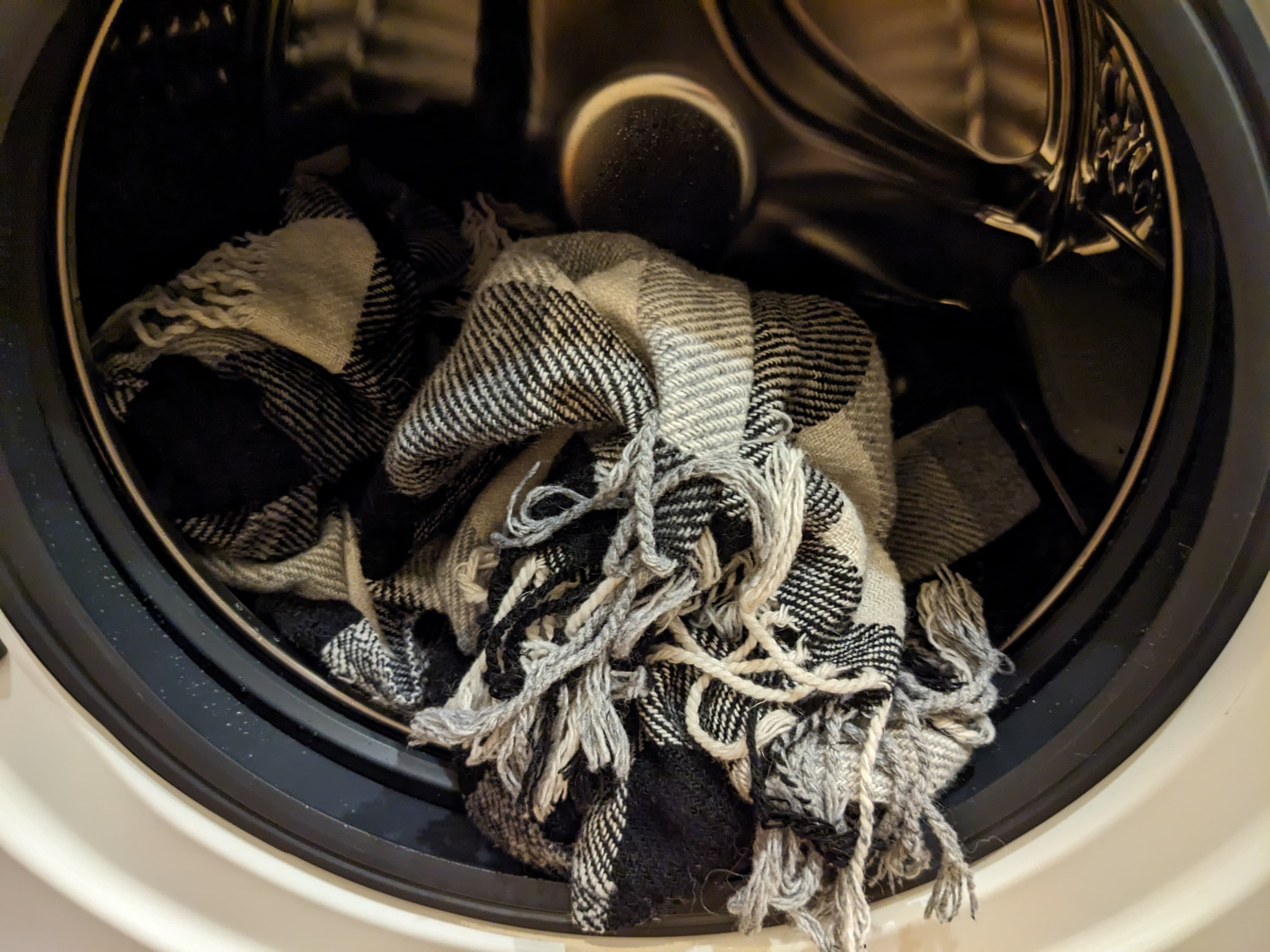 В барабане пледу было просторно и комфортно, судя по результату: чистая ткань, слегка влажная после отжима на минимуме, досохла при комнатной температуре за пару часов и осталась такой же мягкой и приятной на ощупь, как и до стирки.