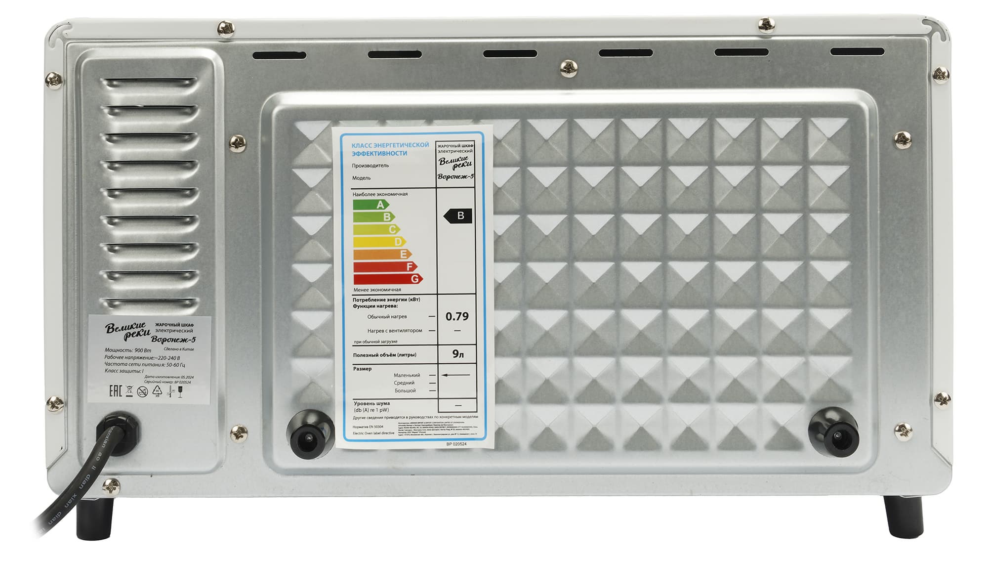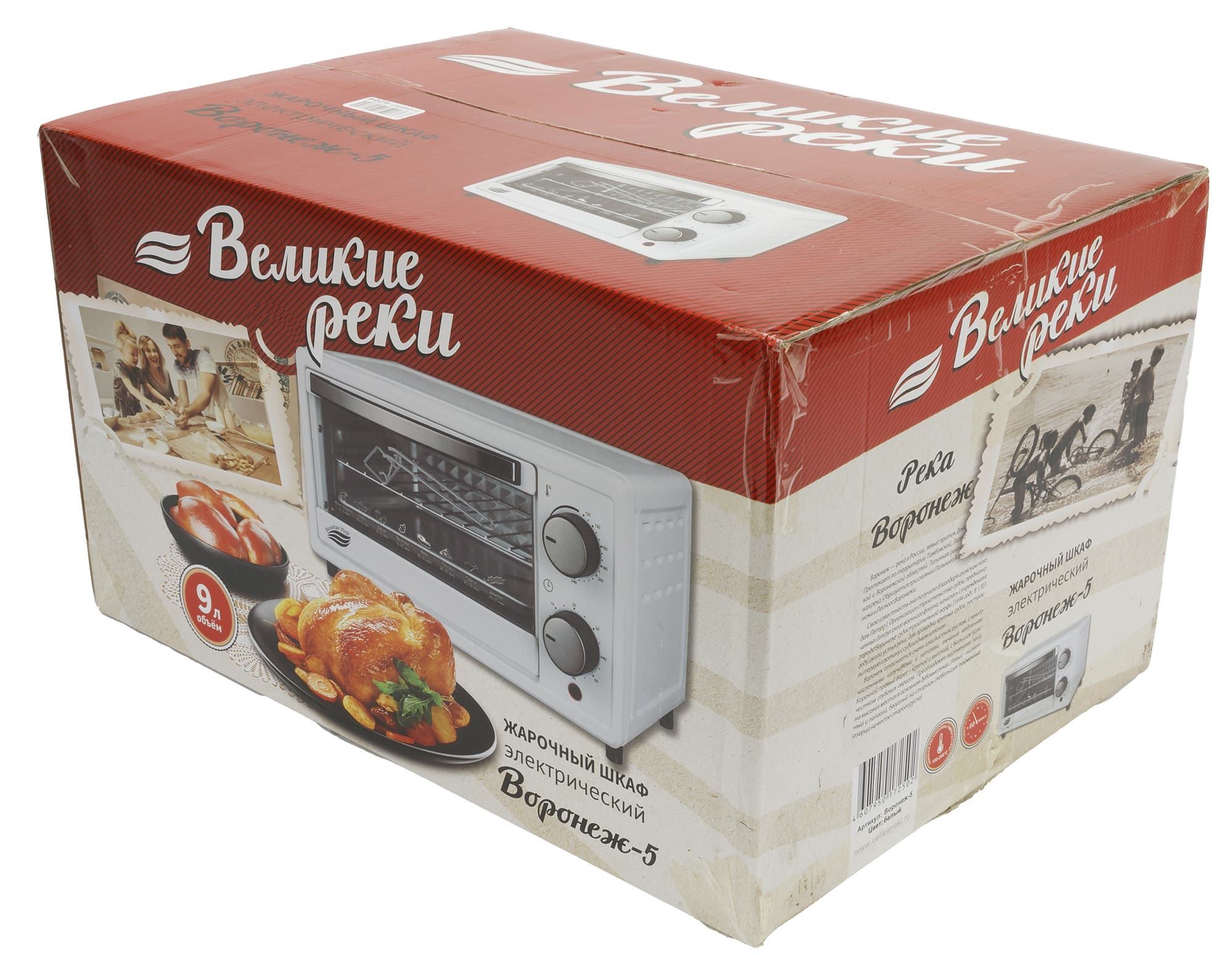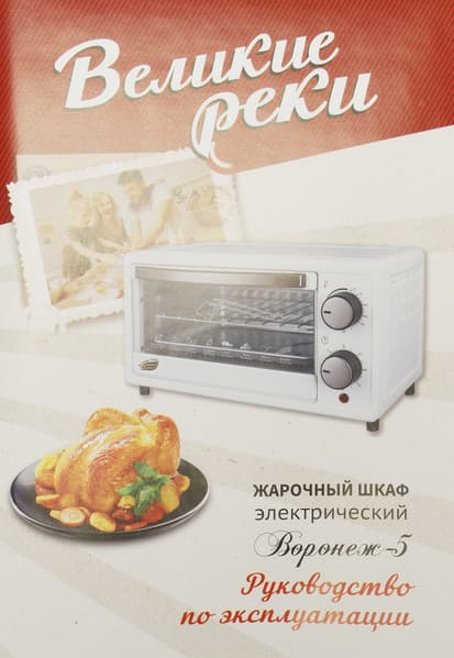 Духовой шкаф попал к нам на тесты в белой картонной коробке, на передней стороне которой указан бренд, есть фотографии самого устройства и блюд, приготовленных с его помощью. На одной боковой стороне размещена краткая географическая справка о реке Воронеж, в честь которой названа модель прибора, а на другой — указаны основные технические характеристики устройства.