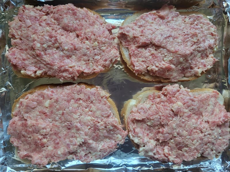 Всё перемешивается, солится, перчится и намазывается на булку. Слой должен быть не очень толстым, иначе фарш не пропечется.