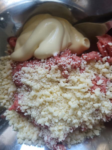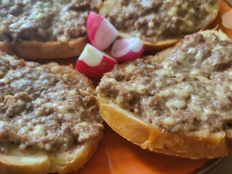 На эту мысль нас натолкнул производитель, у которого на сайте написано про горячие тосты на завтрак. И мы вспомнили старый советский рецепт: горячие бутерброды, которые делаются из смеси сырого фарша, сыра и небольшого количества майонеза (или яйца).