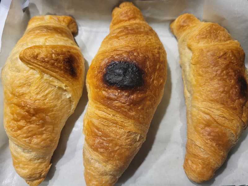 Потом мы решили проэкспериментировать еще раз, сразу поставив противень на нижний уровень. Результат нас порадовал — правда, мы передержали круассаны на расстойке, поэтому они немного расползлись, но зато не подгорели сверху.