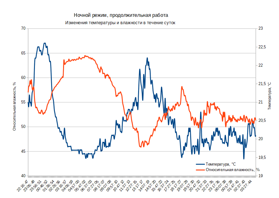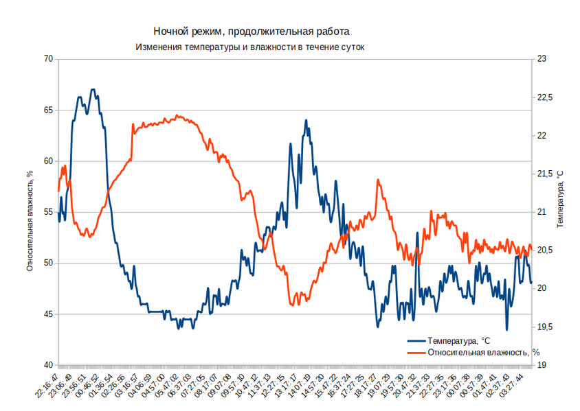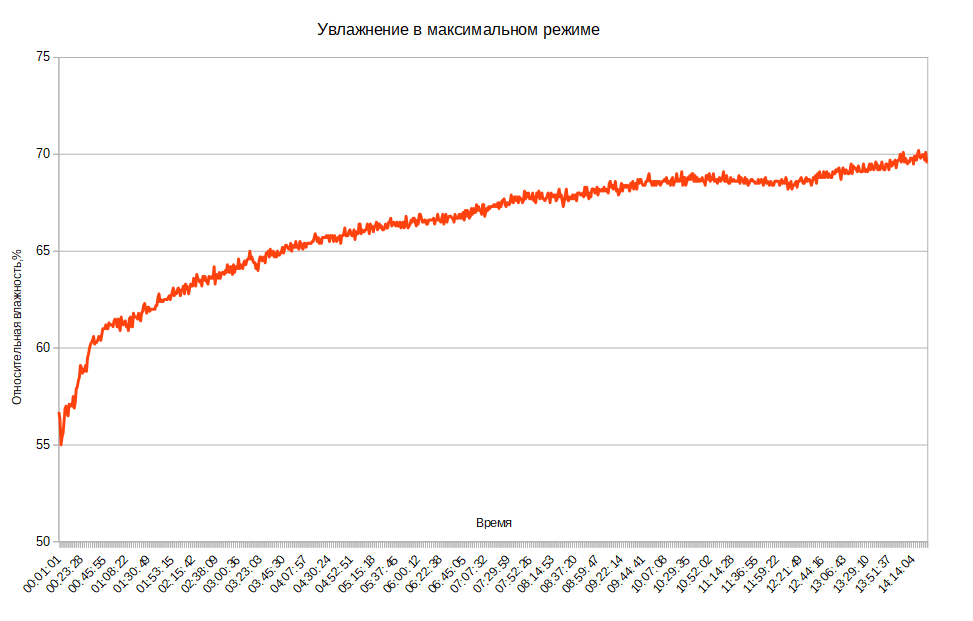 Во время этого теста прибор был включен в обычном жилом помещении (трехкомнатная квартира площадью около 70 м²) на экономичном ночном режиме. Обычная дневная влажность в этой квартире составляет 50%-55%, опускаясь ночью до 35%-40%.