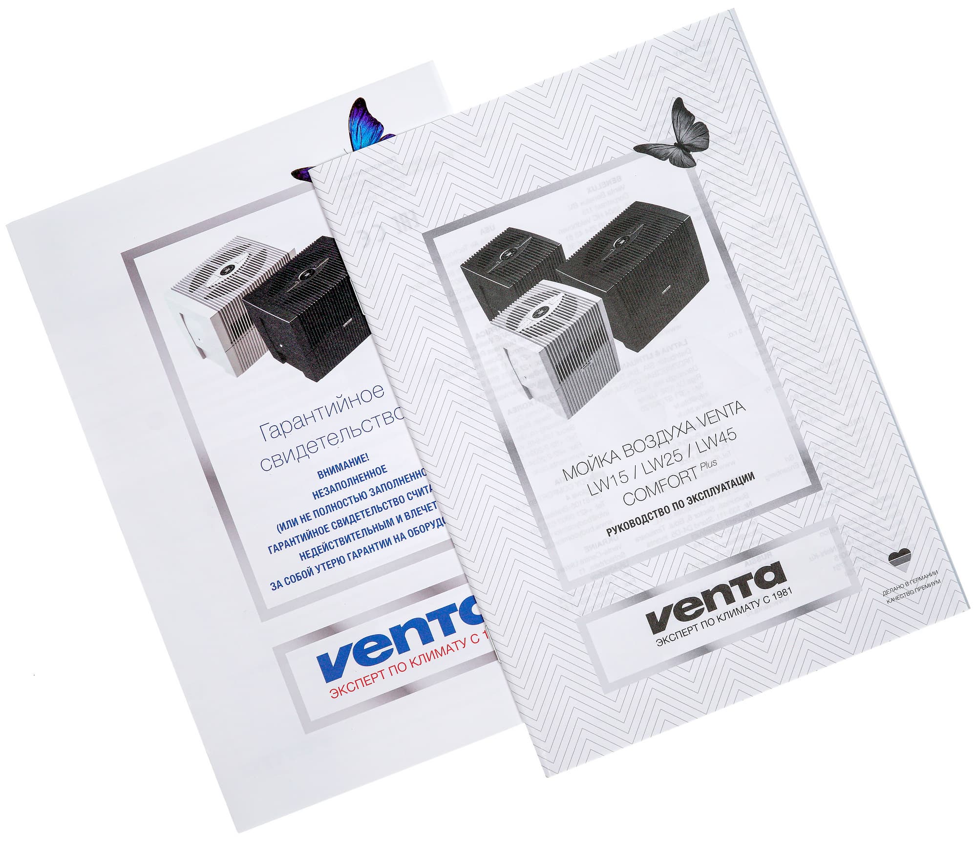 Руководство пользователя мойки воздуха Venta LW45 Comfort Plus представляет собой брошюру A5 любопытного вида: первая страница со схемами и пояснительными рисунками сложена гармошкой в четыре раза и разворачивается вбок от основной книжки руководства. Это позволяет изучать текст инструкции, сверяясь с изображениями и не листая страницы вперед-назад. Крайне удобный формат документации, который мы рекомендуем взять на заметку всем производителям бытовой техники.