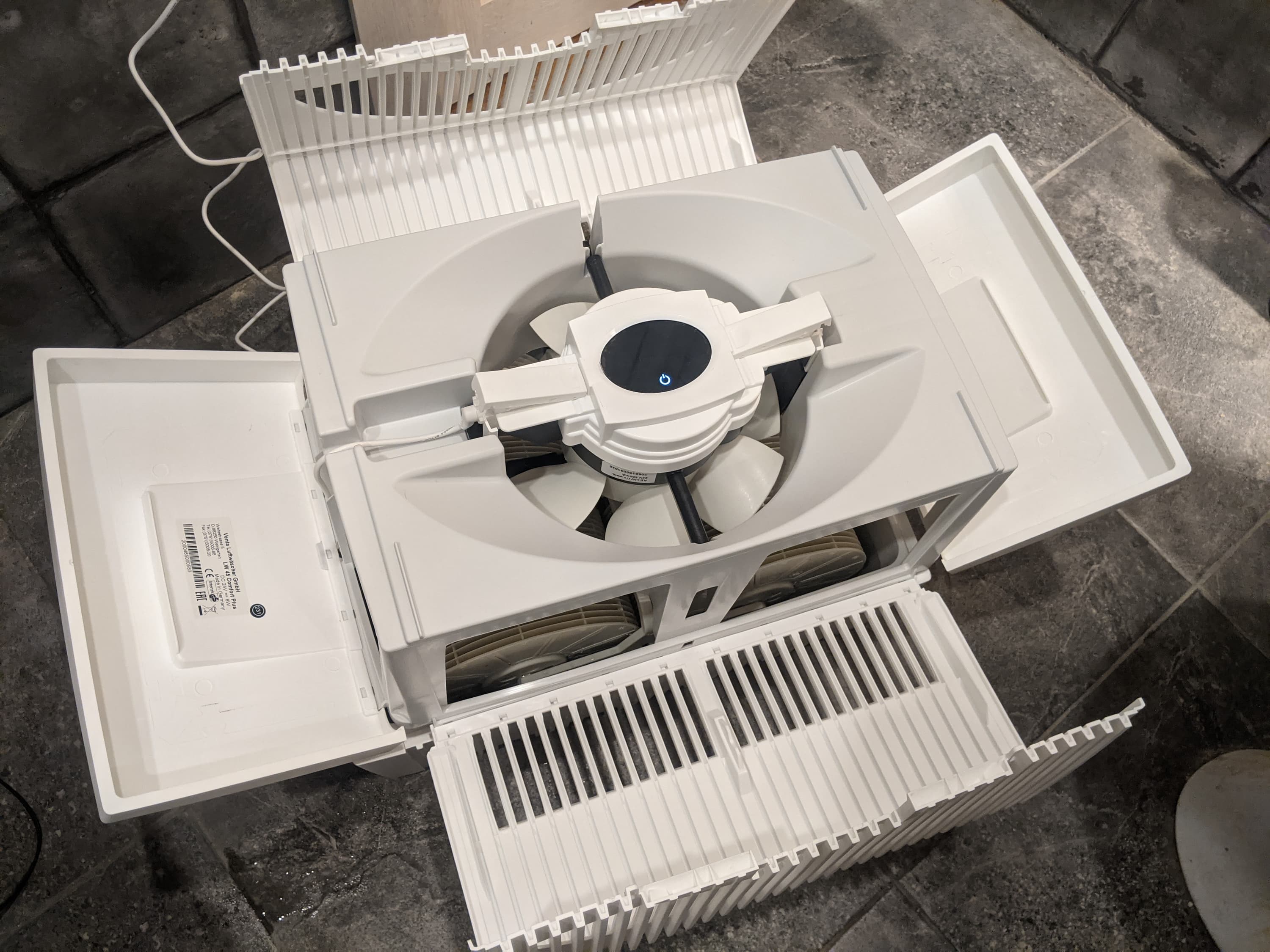 Корпус устройства состоит из двух частей. Нижняя половина — это десятилитровый водяной резервуар, на который устанавливается верхняя крышка с вентилятором, дисплеем и электронным блоком управления.