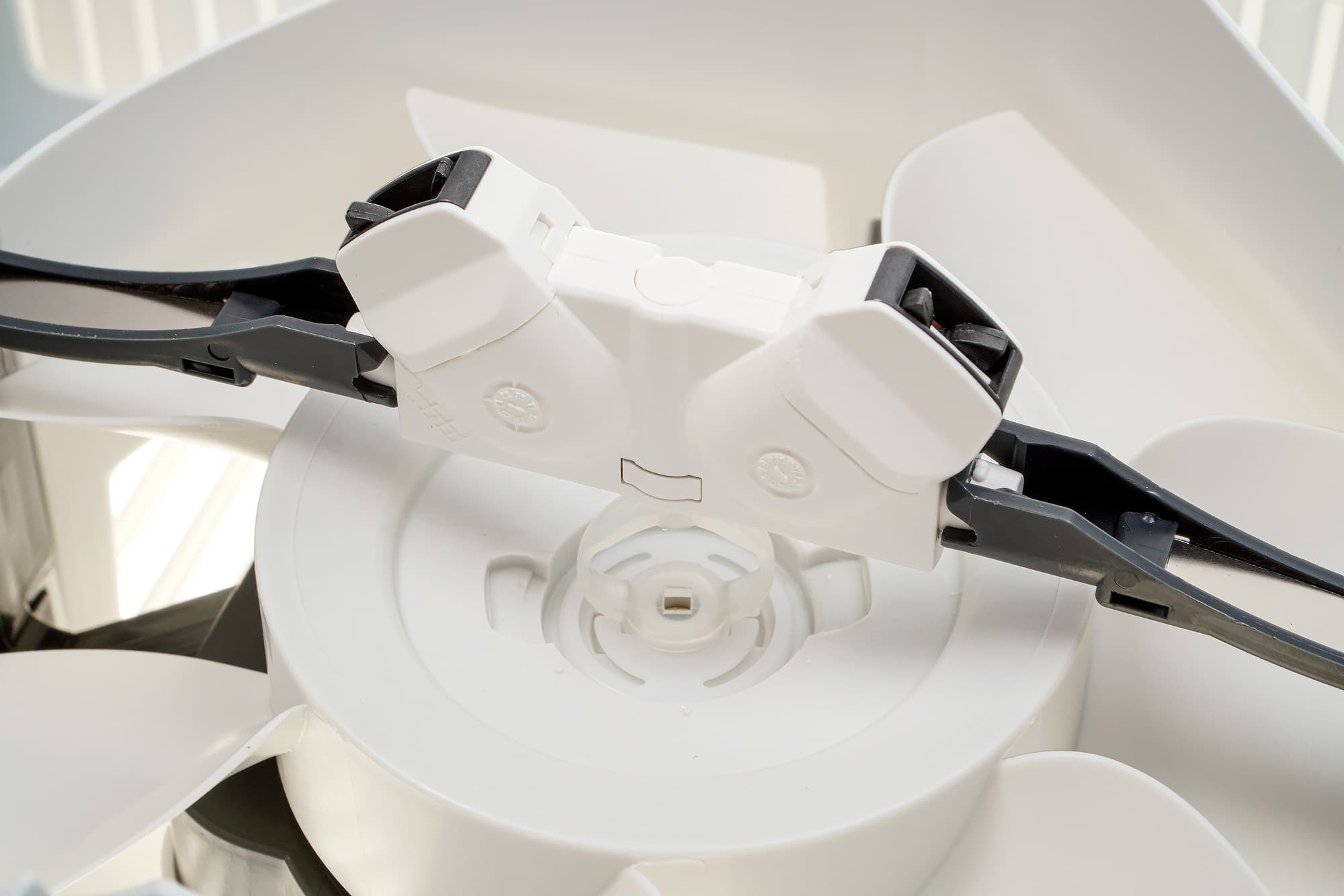 Роторы приводятся в движение двумя парами зубцов, которыми управляет кривошипный механизм, смонтированный на амортизирующей подвеске. Вращение на него передается с вентилятора устройства при помощи пружинящей пластиковой детали. Благодаря этому остроумному решению у мойки воздуха только один электродвигатель, что повышает надежность прибора, а также снижает шум и энергопотребление.