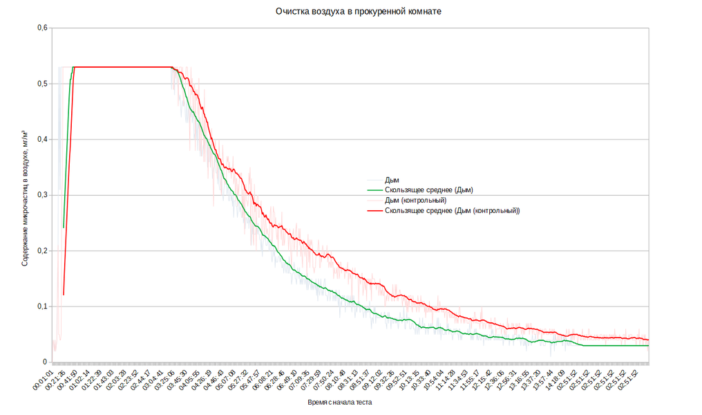 Количество дыма в помещении превышало пороговое значение датчика, и реальные данные измерительное устройство начинало получать чуть более чем через три часа с начала теста. На графике можно видеть, что количество взвешенных в воздухе частиц при работе мойки воздуха (зеленый график) уменьшается заметно быстрее, чем при естественном осаждении сигаретного дыма (красная линия).