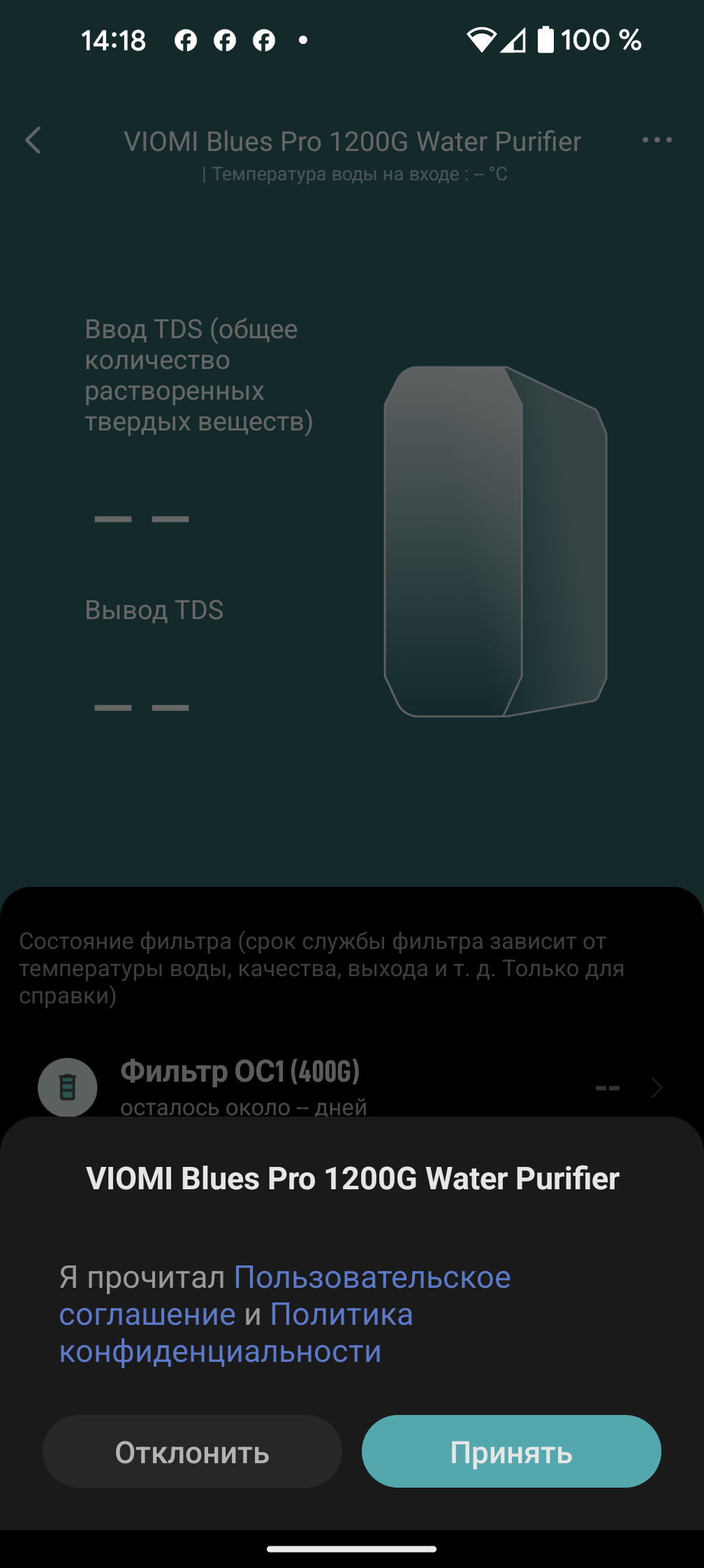 На главном экране приложения отображается ресурс всех трех фильтрующих картриджей в процентах и днях. Информация о времени жизни расходников — вещь сама по себе полезная, но значительно больше нам понравилась возможность воочию убедиться в эффективности устройства: рядом со схематическим изображением программа выводит показания встроенных TDS-метров.