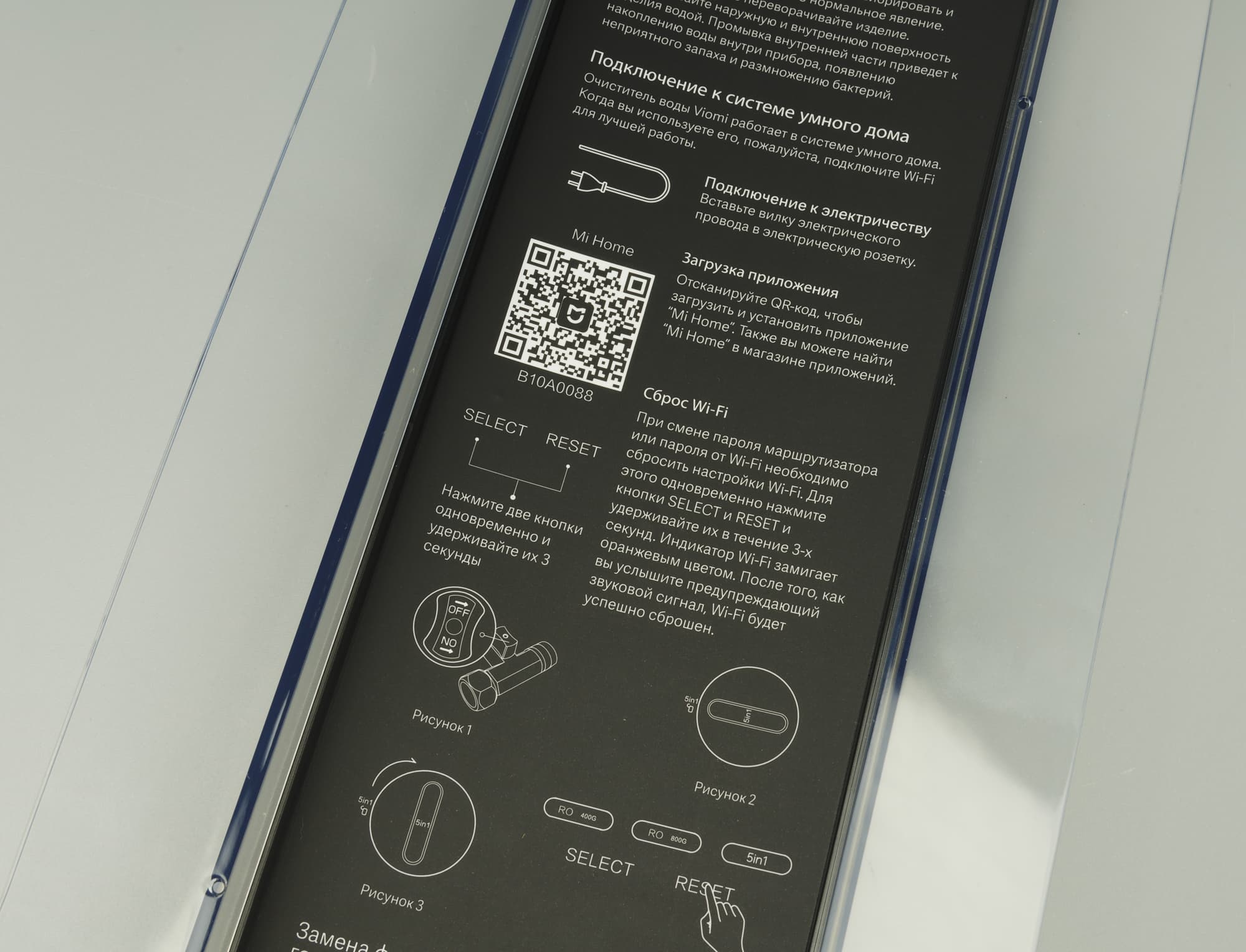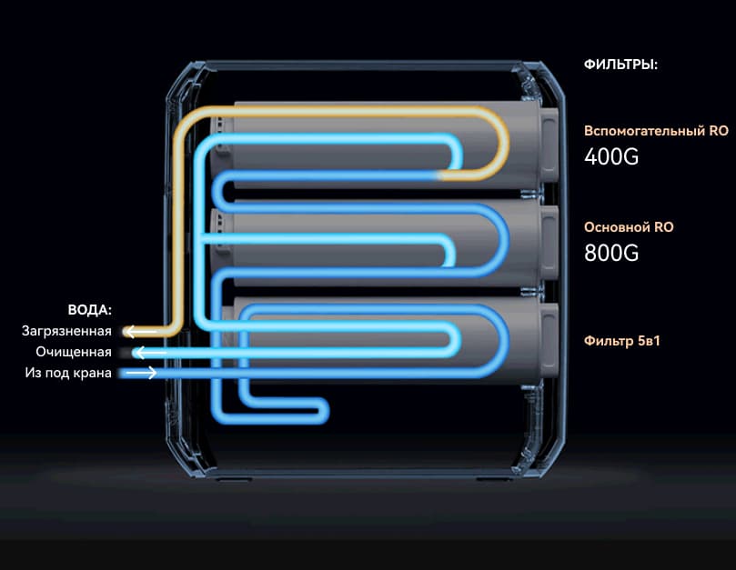 Единственная неожиданность, смутившая нас поначалу, — звук электрического насоса, расположенного за предварительным фильтром. В отличие от большинства знакомых нам аналогов, перед осмотическими фильтрами в Viomi Blues Pro 1200G стоит дополнительный нагнетатель, повышающий давление в системе. Он включается автоматически при открывании крана и выключается при его закрытии. Приблизительно через минуту после прекращения подачи воды насос еще раз кратковременно включается: вероятно, так реализована промывка осмоса.