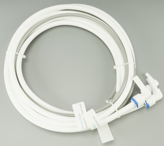 Чистая отфильтрованная вода подается в кран, который врезается в столешницу, а вода с остаточными загрязнениями сливается из фильтра в канализацию по отдельному шлангу.