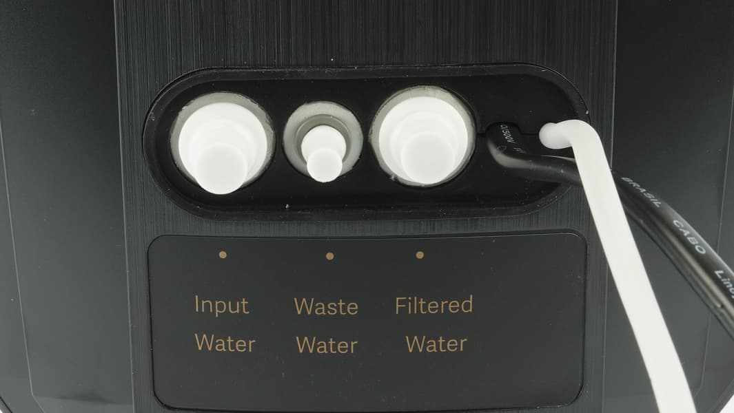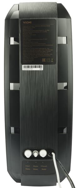 В нижней части задней стенки — три разъема для подключения коммуникаций. Первое отверстие предназначено для магистрального водопровода, через второе в канализацию выводится отработанная вода, а в третье монтируется кран с чистой. Черный провод, выходящий из корпуса, нужен для питания устройства (да-да, для работы Viomi Blues Pro 1200G требуется электросеть), а к серому через специальный разъем присоединяется кран.
