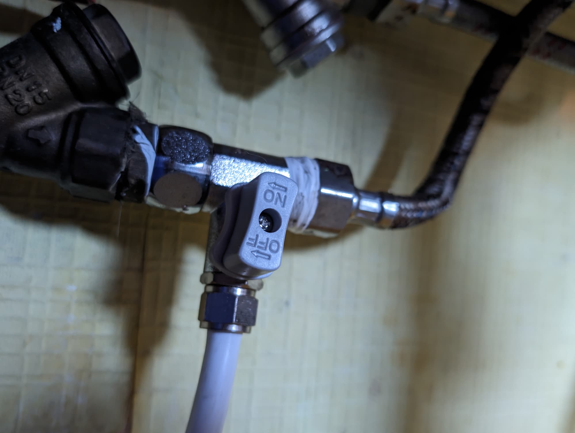 Для подключения к магистрали ХВС используется входящий в комплект кран-тройник с внутренней и внешней резьбой на ¾″. Мы разместили его перед гибкой подводкой, питающей основной кухонный кран. Вносить в исходную систему существенных изменений не потребовалось.