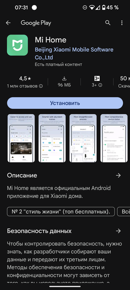 Для использования с системой производитель предлагает Mi Home (Beijing Xiaomi Mobile Software Company). Популярное приложение насчитывает более 50 миллионов скачиваний и имеет рейтинг 4,5 из 5 на основе более 1,23 млн отзывов. Мы уже подключали к нему разные приборы в предыдущих обзорах.