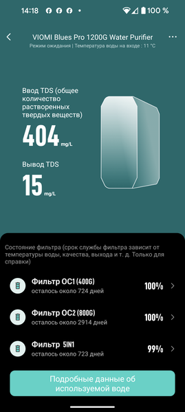 Фильтр измеряет температуру воды и общее солесодержание в миллиграммах на литр на входе и выходе в устройство. На прилагаемом скриншоте можно видеть, что у воды, поступающей в систему из нашей магистрали ХВС, повышенная минерализация: целых 404 мг/л (при норме 75—250 мг/л). TDS чистой воды составляет всего 15 мг/л — почти дистиллят.