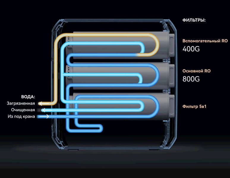 На третьем этапе вода проходит через еще одну мембрану обратного осмоса, размещенную в картридже RO-400G Pro. Фильтр тонкой очистки снабжен внутренним стержнем из активированного угля и обеспечивает, согласно информации от производителя, высококачественную очистку воды от частиц размером до 0,0001 мкм. Ресурс фильтра также составляет 10 800 литров, но рекомендуемая периодичность замены меньше, чем у предыдущего — не более 24 месяцев.