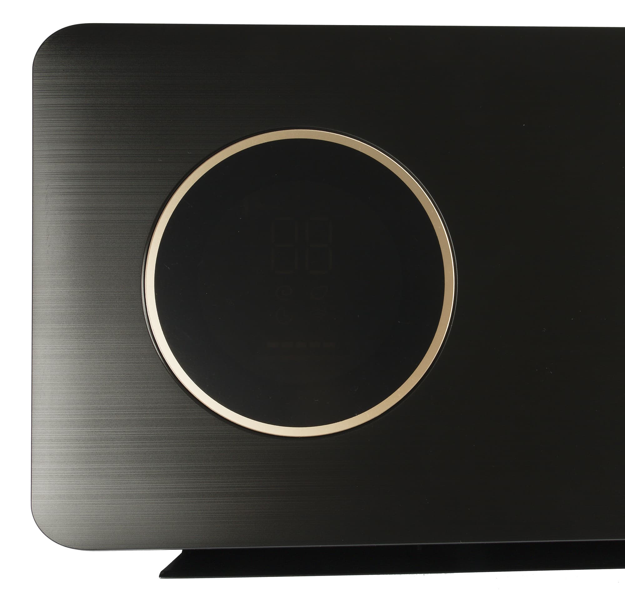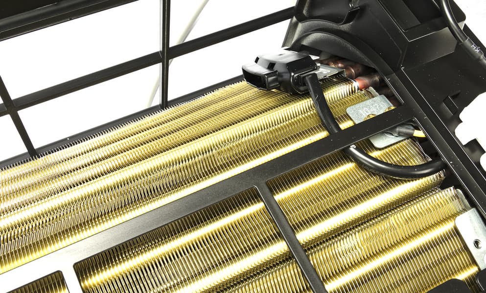 Элементы теплообменника покрыты анодированным покрытием золотистого цвета. В правой части, между решеткой и сеткой фильтра, размещен УФ-излучатель.