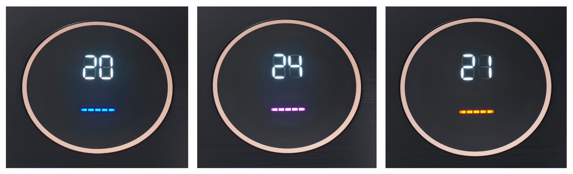 - Индикатор в виде полоски горит синим, когда кондиционер находится в режиме охлаждения воздуха, оранжевым — в режиме обогрева, и фиолетовым — во всех остальных режимах.