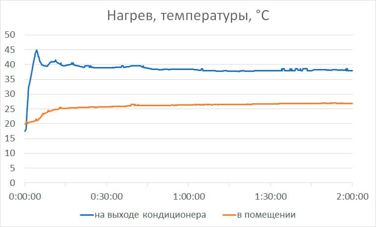 Чтобы продемонстрировать принцип работы устройства, мы разместили два температурных датчика — один на выходе внутреннего блока, второй — в помещении на участке без прямого попадания воздушного потока. Устройство работало в режимах охлаждения и нагрева, в автоматическом режиме. Также параллельно измерялось энергопотребление кондиционера.