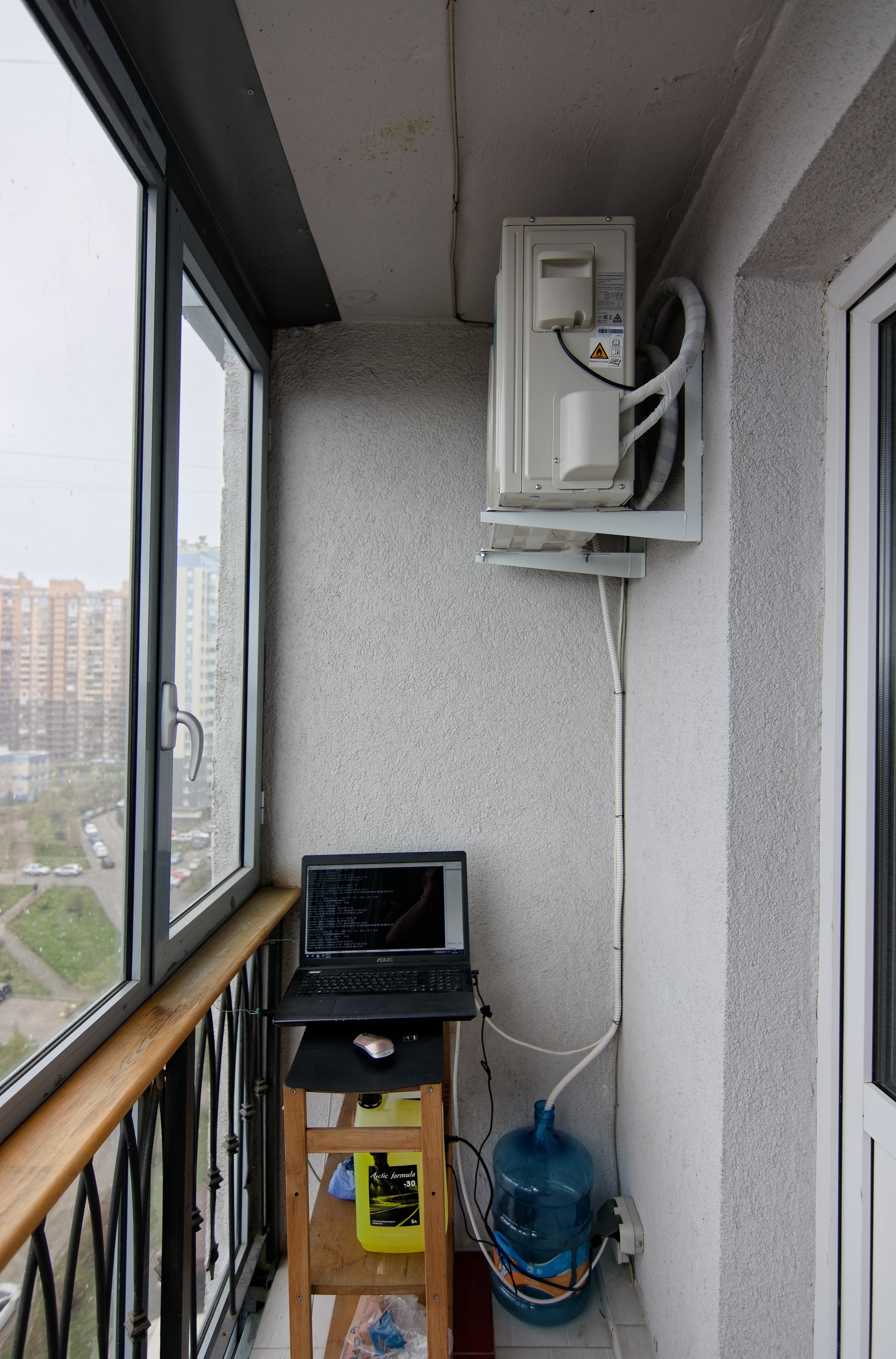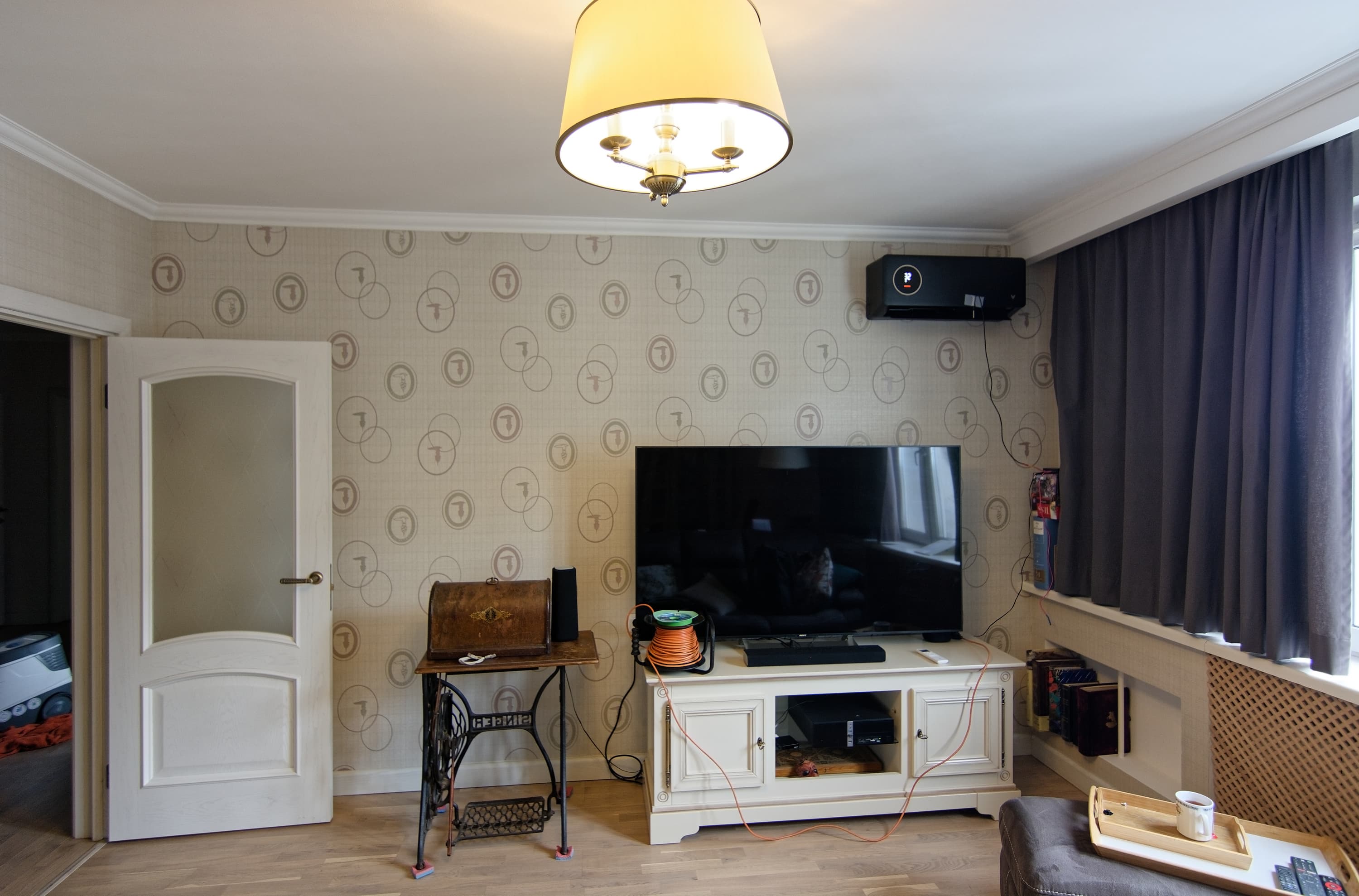 На этот раз было решено установить кондиционер в гостиную. Это объяснялось как опасениями хозяев по поводу лишних шумов в спальне, так и условиями установки: из гостиной достаточно легко сверлилось отверстие в лоджию, а установка внешнего блока в лоджии не требует ни дополнительных согласований, ни вызова промышленных альпинистов (квартира располагается на 11-м этаже).
