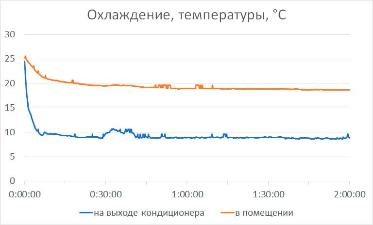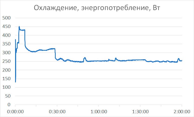 Здесь мы видим довольно стандартную для инверторного устройства картину: температура воздуха на выходе из кондиционера была довольно быстро доведена до минимума, но со временем затраты электроэнергии на поддержание этого минимума довольно существенно сократились, и начиная примерно с получаса и далее кондиционер тратил на поддержание в комнате температуры около 18 °C всего лишь около 250 ватт. При этом температура в комнате оставалась более-менее стабильной, что свидетельствует о том, что выбранная мощность адекватно соответствует объему помещения.