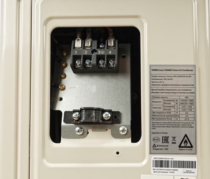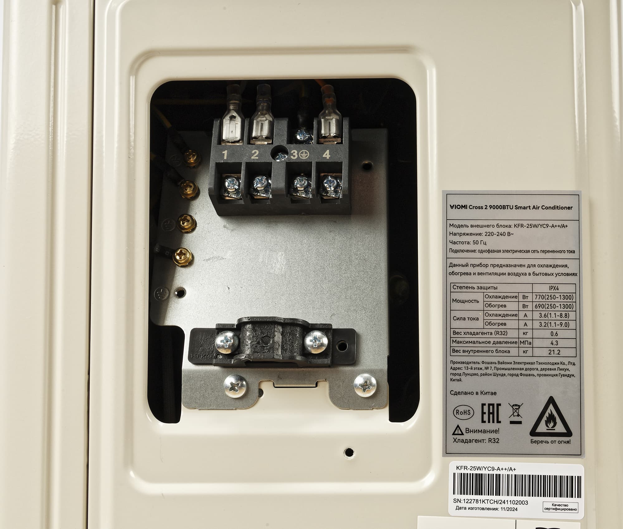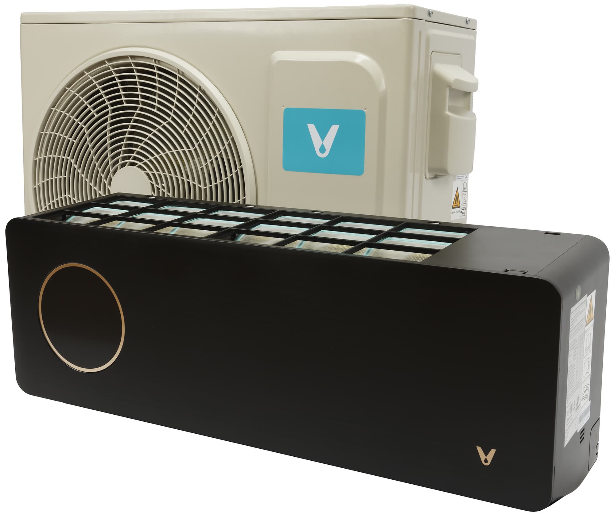 В линейке сплит-систем Viomi Cross 2 представлены кондиционеры различной мощности (9000, 12000 и 18000 BTU) в двух цветовых решениях — белом и черном. Сегодня мы рассматриваем девятитысячную модель с черным внутренним блоком. Сплит-система состоит из внутреннего KFR-25G/Y4CM1-A++/A+ и наружного KFR-25W/YC9-A++/A+.