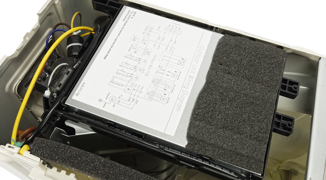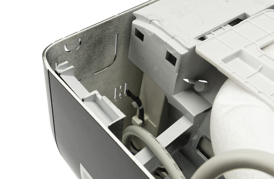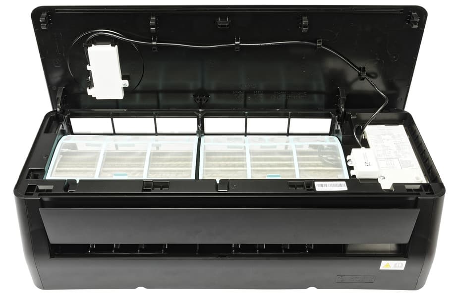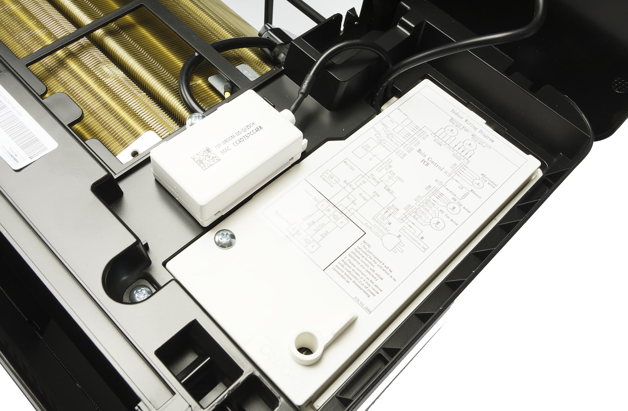 Передняя стенка блока открывается вертикально вверх, открывая доступ к противопылевым фильтрам, испарителю и внутренней электронике. На ней смонтирован блок дисплея, соединенный с основной платой гибким черным проводом.