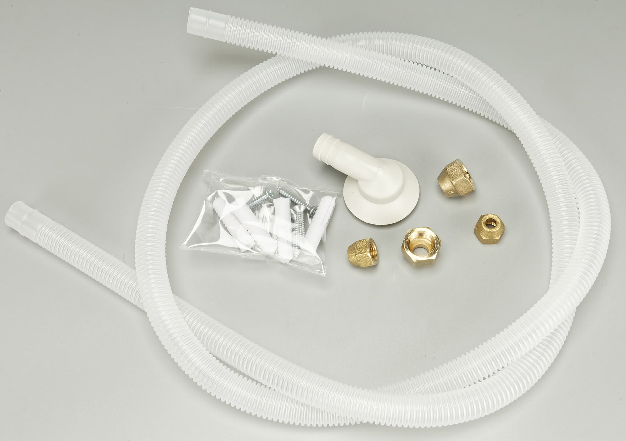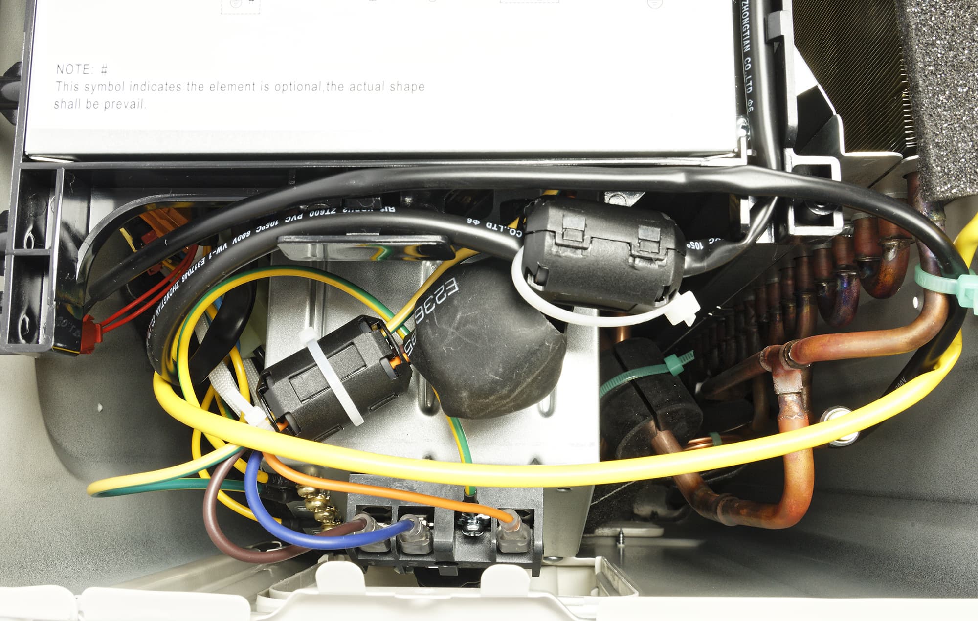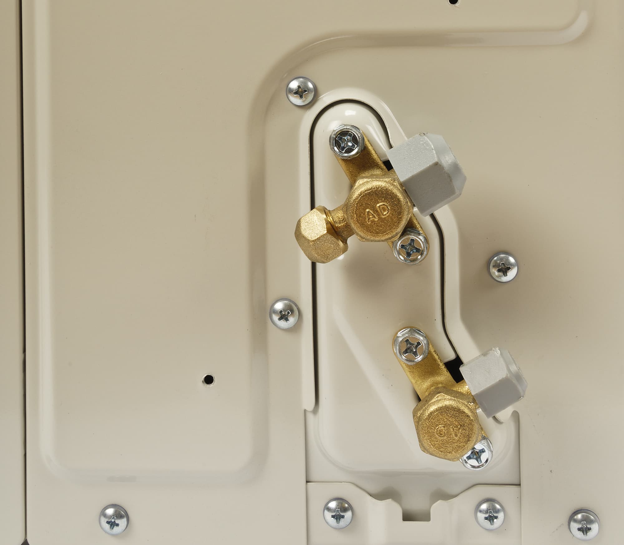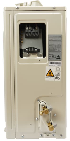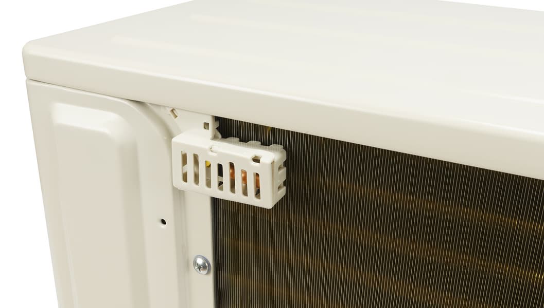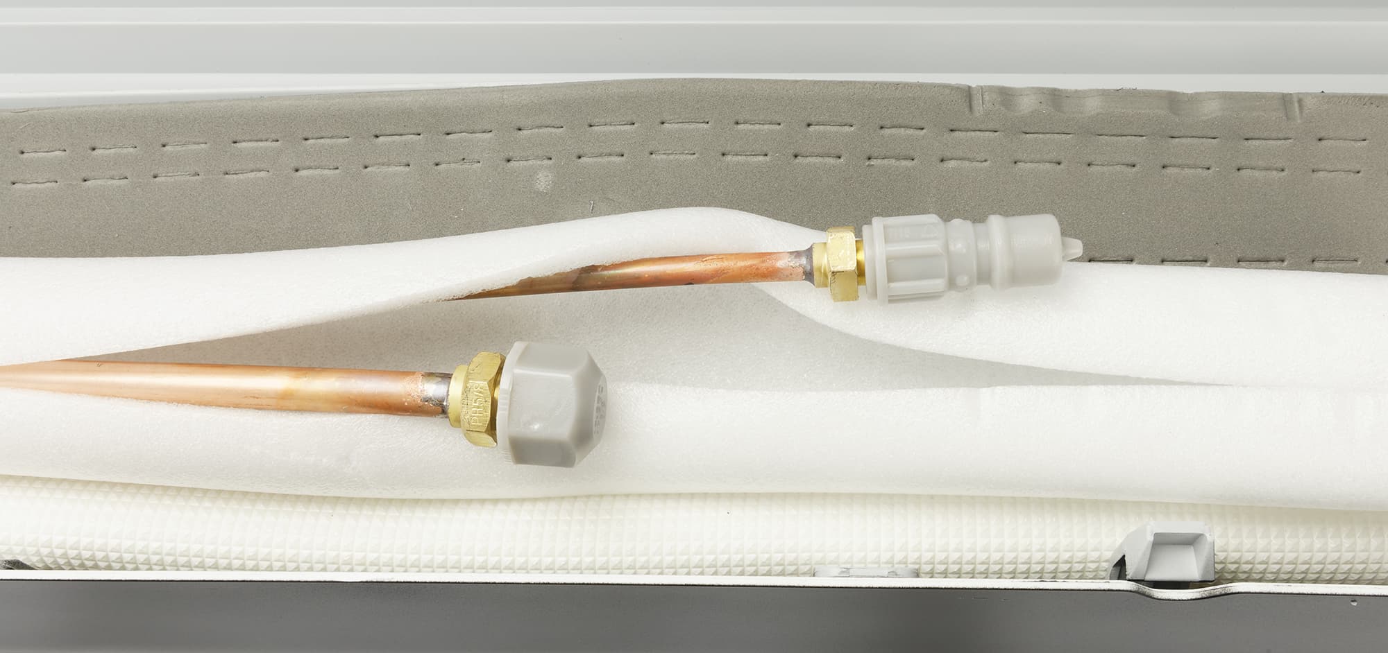 Медные трубки для хладагента закрыты теплоизоляционным материалом и снабжены защитными колпачками из пластика. При установке заглушки заменяются латунными конусными гайками, входящими в комплект поставки.