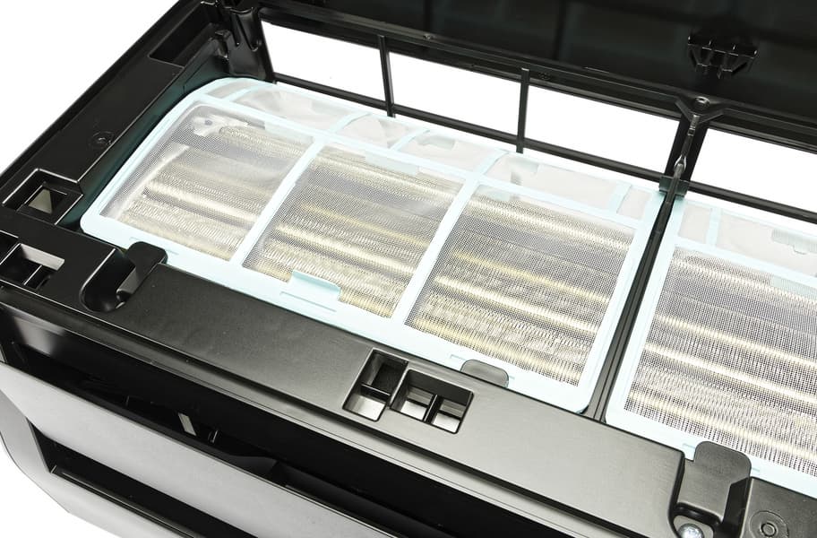 Не реже раза в две недели (разумеется, имеется в виду период, когда кондиционер достаточно активно используется) следует очищать воздушный фильтр. Для этого нужно открыть переднюю панель внутреннего блока, снять воздушный фильтр, потянув его вниз, после чего пропылесосить или промыть теплой водой с мягким моющим средством. Если применялась вода, после этого фильтр следует полностью высушить при комнатной температуре. Далее фильтр следует вставить обратно тем же порядком, как он вынимался.