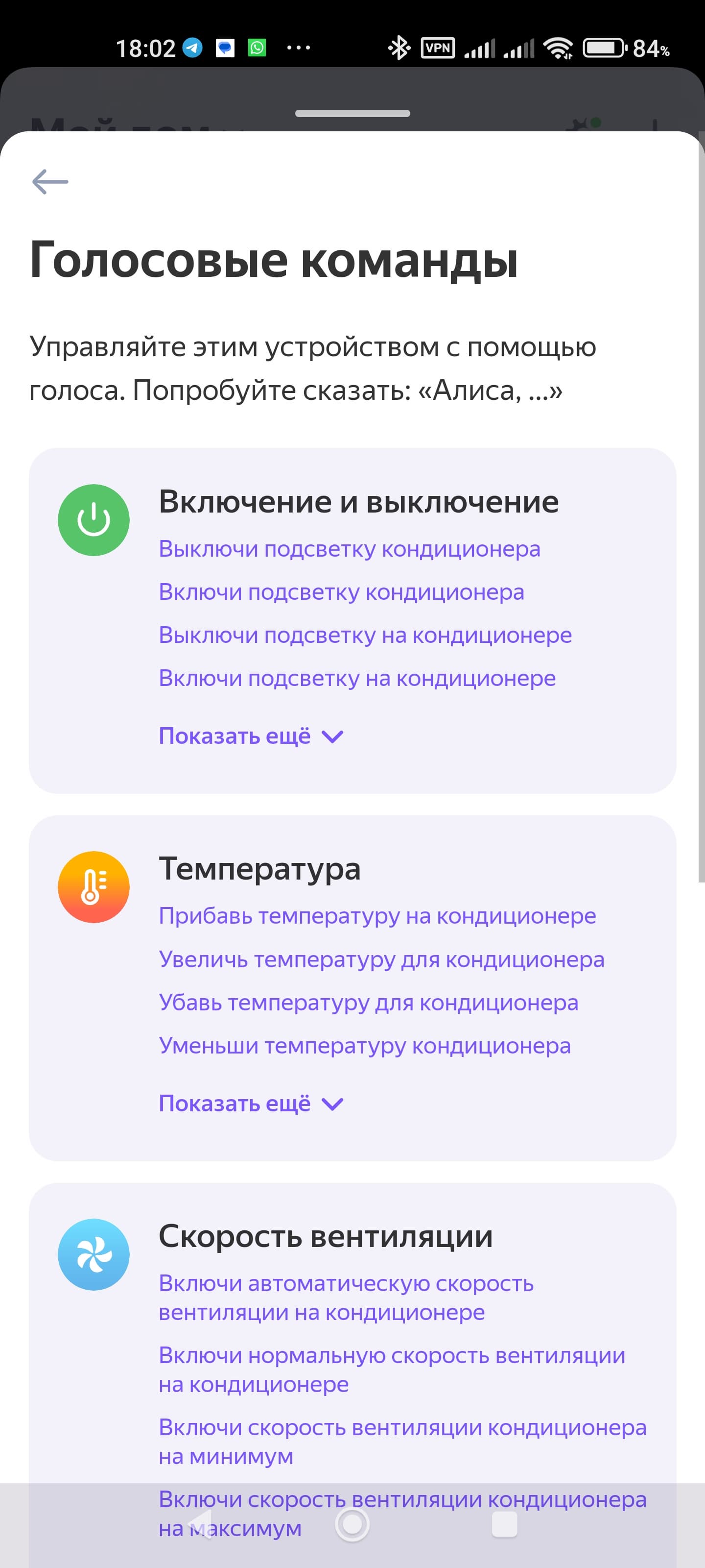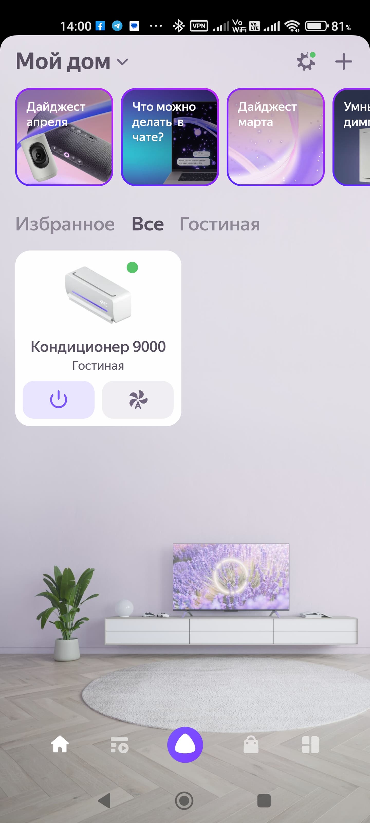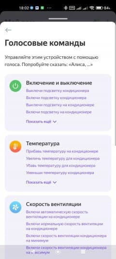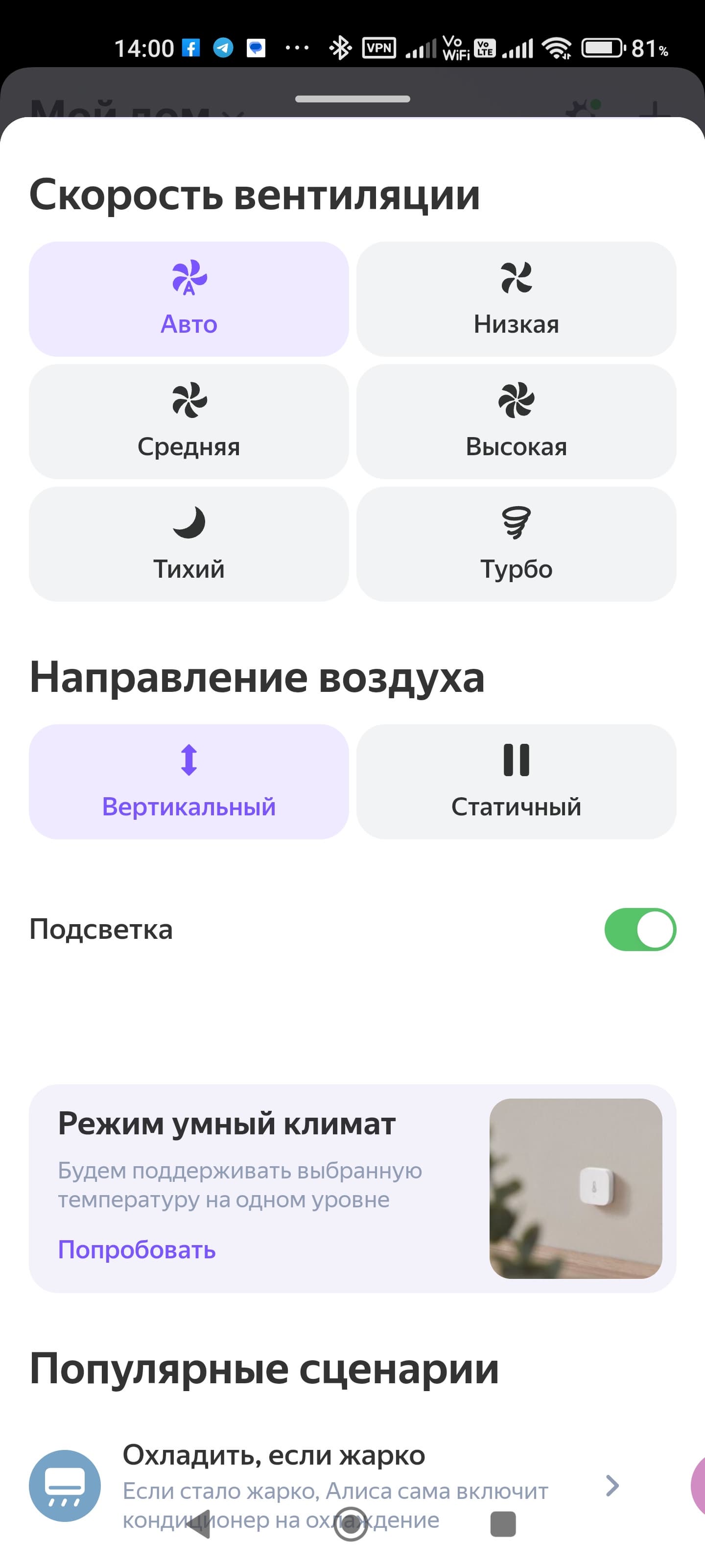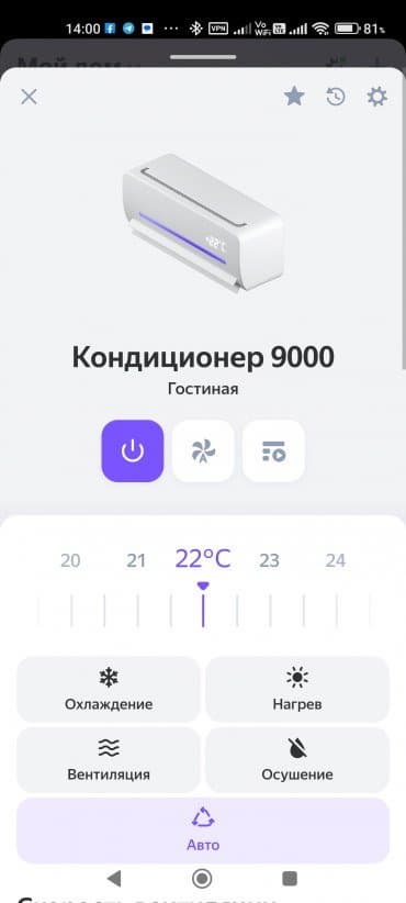 При тапе на появившееся в списке устройство открывается хорошо уже знакомое (нам, по крайней мере) окно Алисы для управления кондиционером. Оно довольно одинаковое для всех устройств этого типа, разве что с поправкой на отсутствующие в них (или еще не реализованные в Алисе) функции.