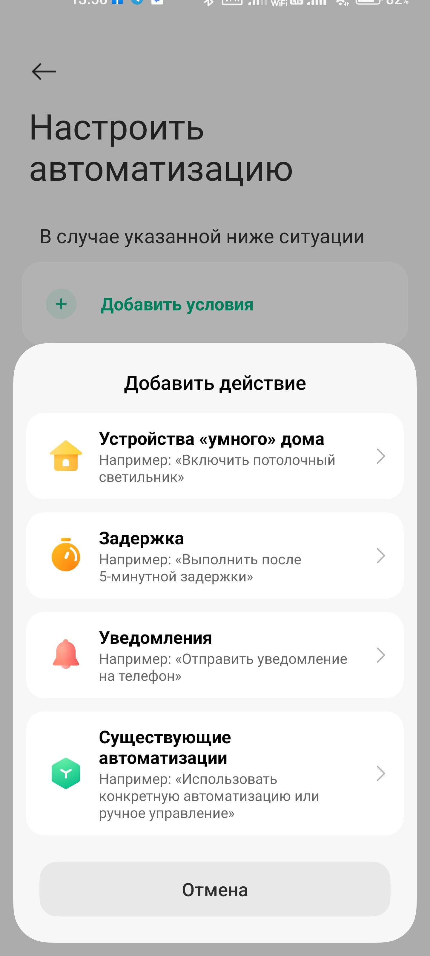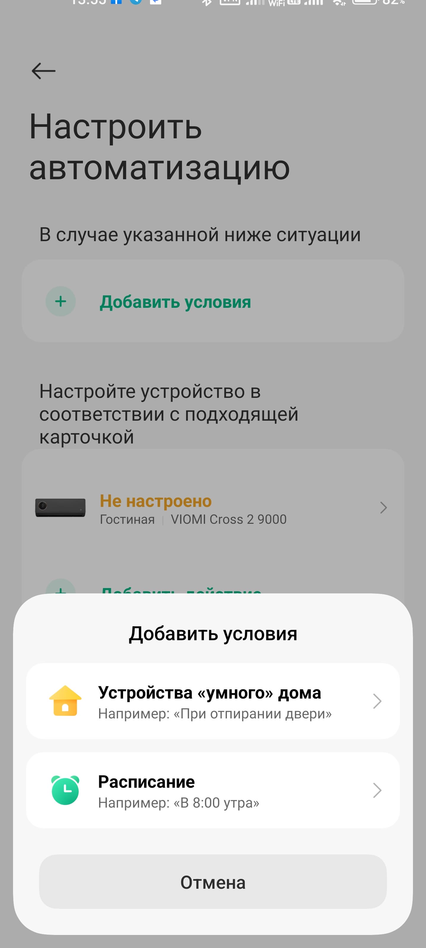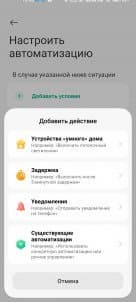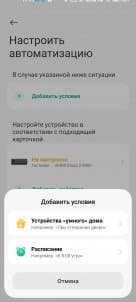 Организация, в принципе, стандартная: можно указывать условия (и не одно), которые будут вызывать некоторые действия (тоже допускается несколько). Как условия, так и действия, могут быть связаны не только с управляемым нами кондиционером, но и с другими умными устройствами, поддерживающими экосистему Xiaomi и приложение Xiaomi Home. Например, можно привязать к Xiaomi Home умный термометр и включать кондиционер с определенными параметрами при определенной температуре.