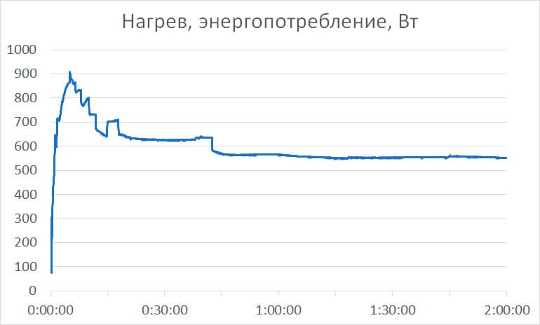 Здесь мы наблюдаем примерно аналогичную картину, только энергии на нагрев тратится существенно больше, чем на охлаждение. Но это тоже совершенно нормально и предсказуемо. Резких колебаний температуры в помещении после первого получаса не наблюдается, это хорошо.