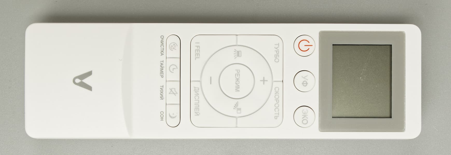 На самом пульте — небольшой жидкокристаллический дисплей и множество кнопок. В центре квадратного блока располагается круглая кнопка «Режим», вполне предсказуемо отвечающая за переключение режимов работы. Кондиционер может работать в режиме охлаждения, обогрева, осушения воздуха, вентиляции, а также в автоматическом режиме.