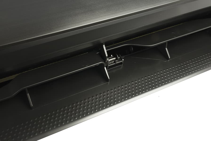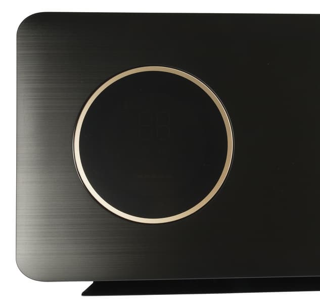 Корпус устройства сделан из черного пластика. Передняя панель украшена текстурным рисунком, в правом нижнем углу мы видим золотистый логотип производителя.