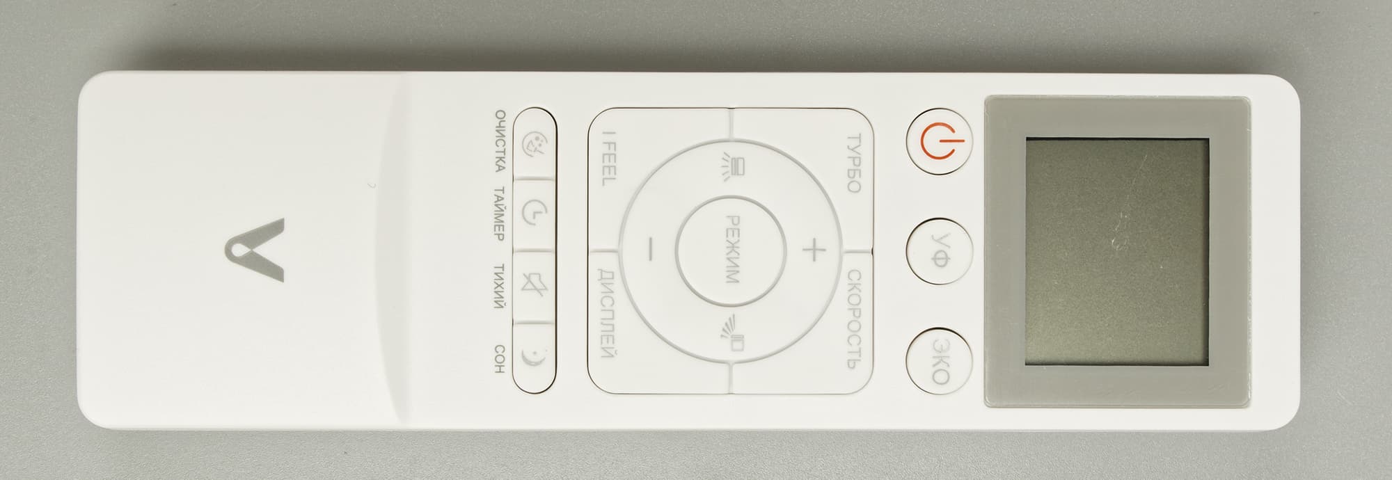 ИК-пульт дистанционного управления питается от двух батареек AAA и позволяет настроить практически все режимы кондиционера (чуть больше возможностей — в приложении). Приятно, что ПДУ в комплекте идет не универсальный (что обычно означает английский), а русифицированный.