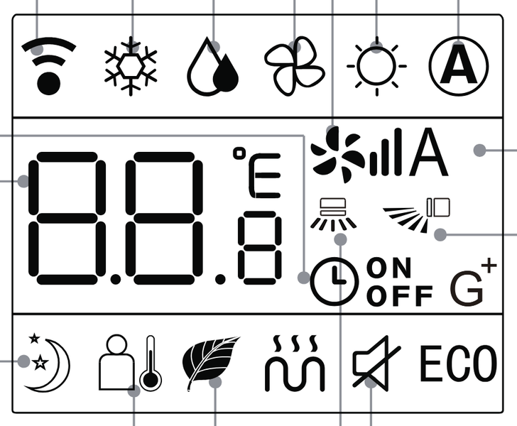 Крупные цифры в центральной части показывают целевую температуру, установленную пользователем. Рядом располагаются индикаторы скорости вращения вентилятора, движения вертикальных и горизонтальных жалюзи и активности таймера автоотключения.