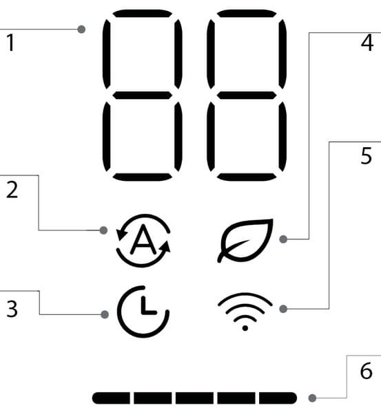 В верхней части жидкокристаллического дисплея отображается выбранный режим работы: могут быть видны иконки охлаждения, осушения, вентиляции, обогрева или автоматической программы. Здесь же расположен индикатор Wi-Fi-соединения.