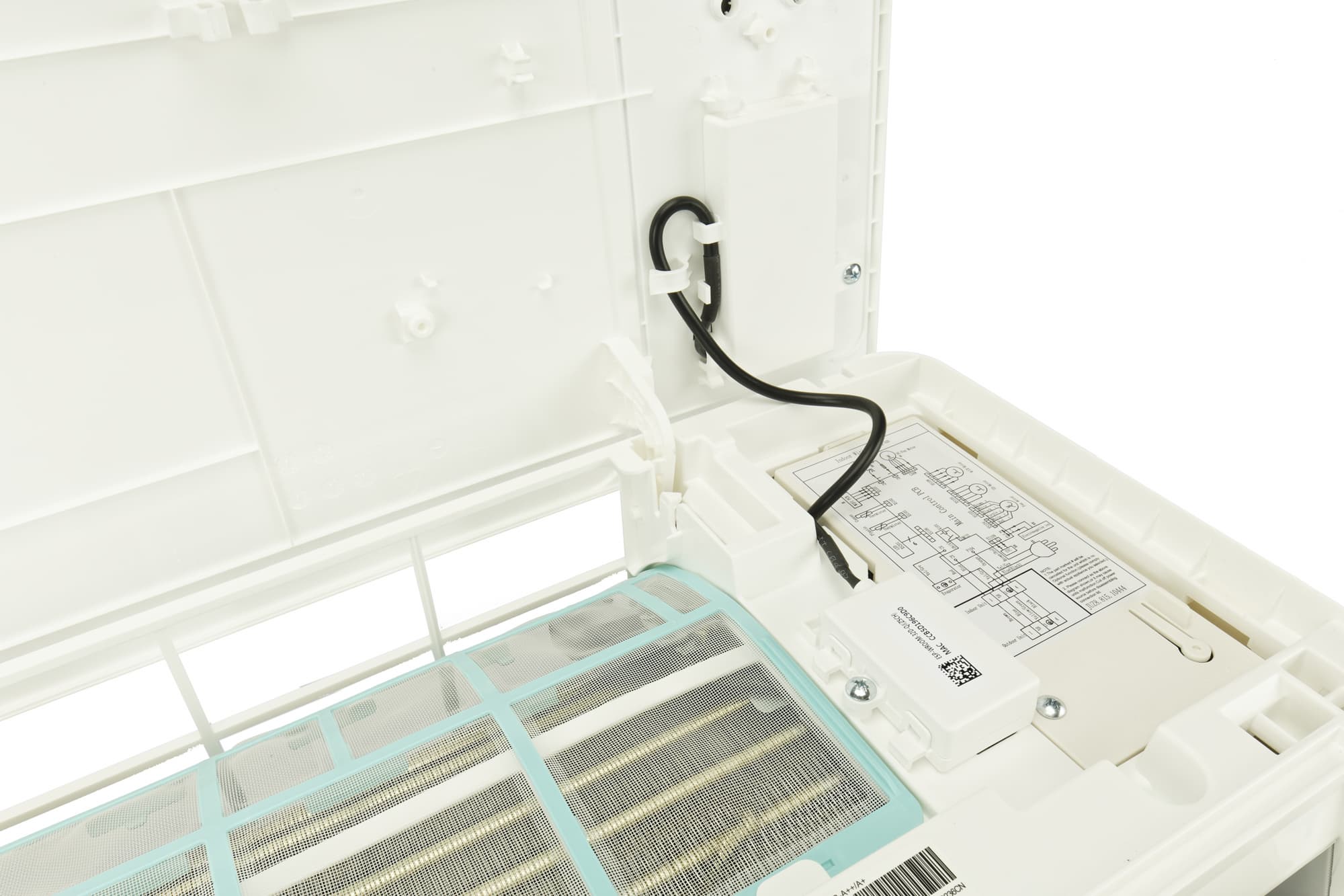 Медные трубки для подачи и возврата хладагента упакованы в теплоизолирующий материал. Рядом с ними проходит белая гофрированная трубка для вывода конденсата. Электропровод длиной 1,5 метра снабжен евровилкой с заземлением: если рядом с местом монтажа расположена розетка, можно не беспокоиться о коммутации.