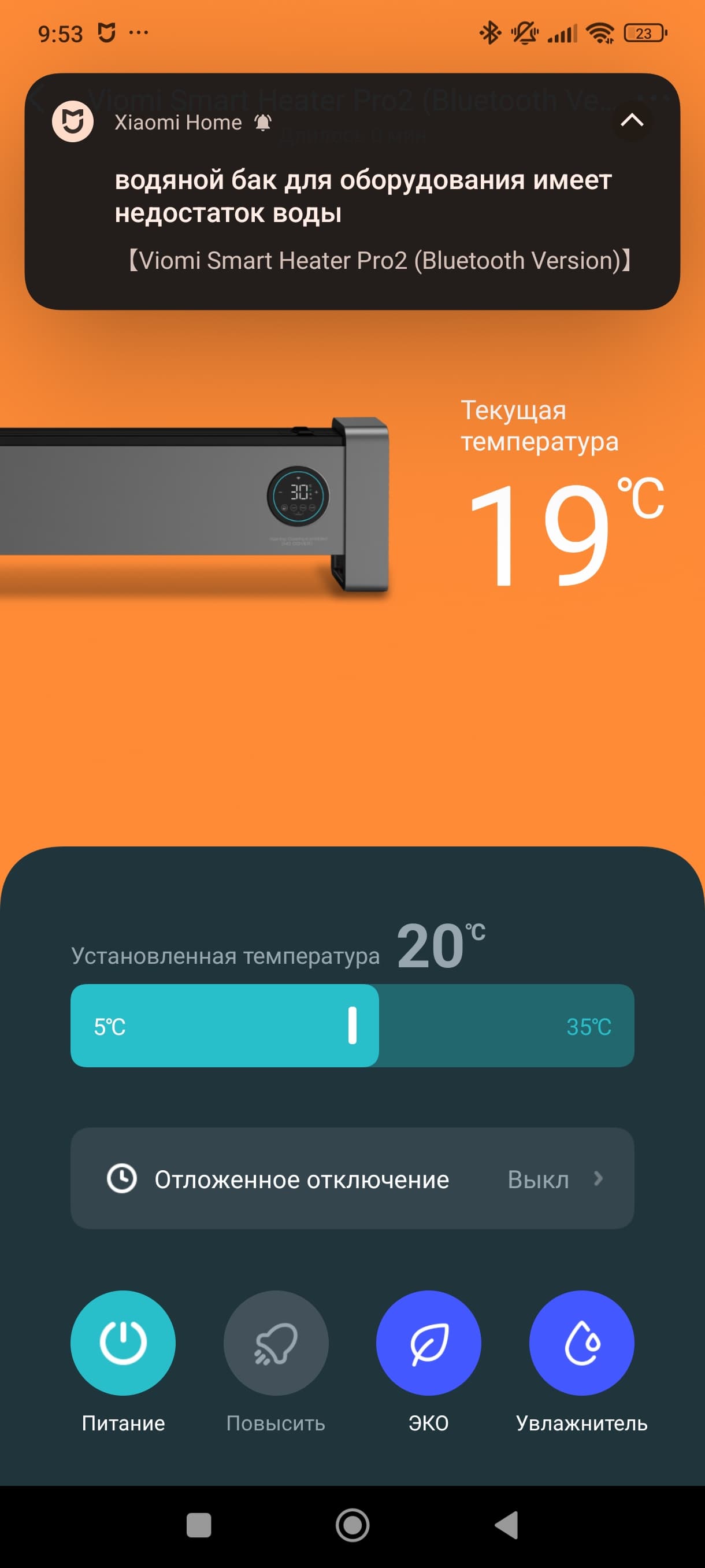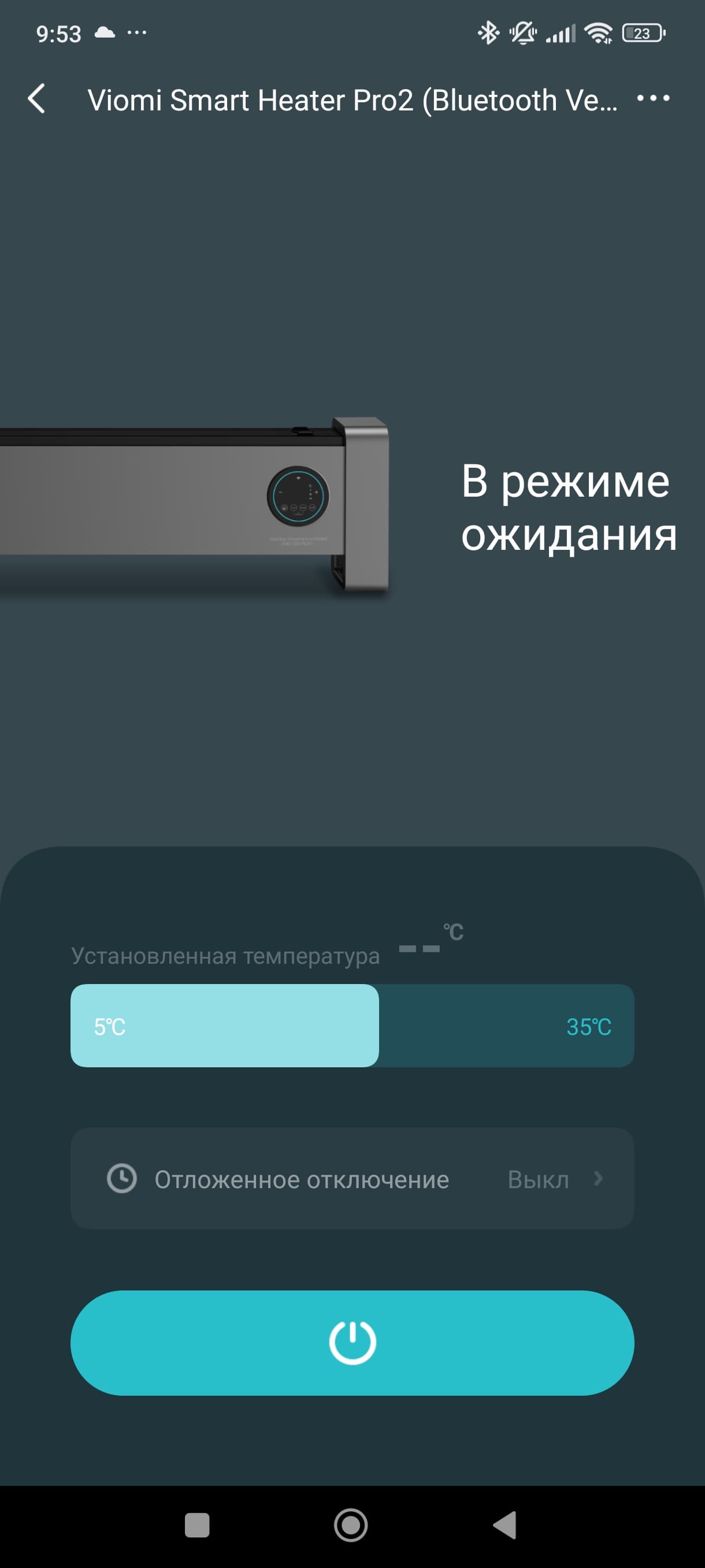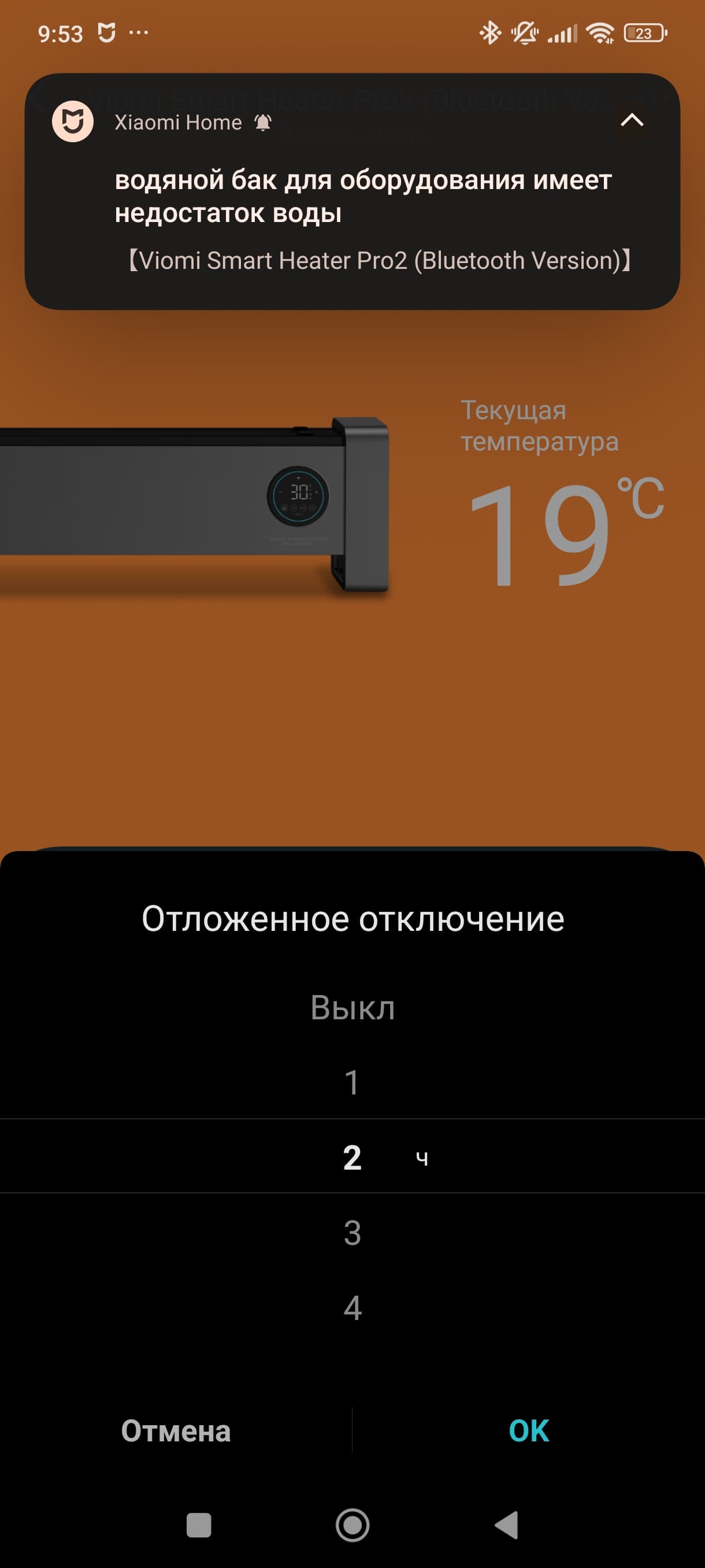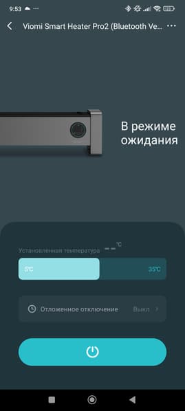 Ниже мы видим предложение задать целевую температура, еще ниже — поставить таймер отключения (до 24 часов с интервалом в 1 час).