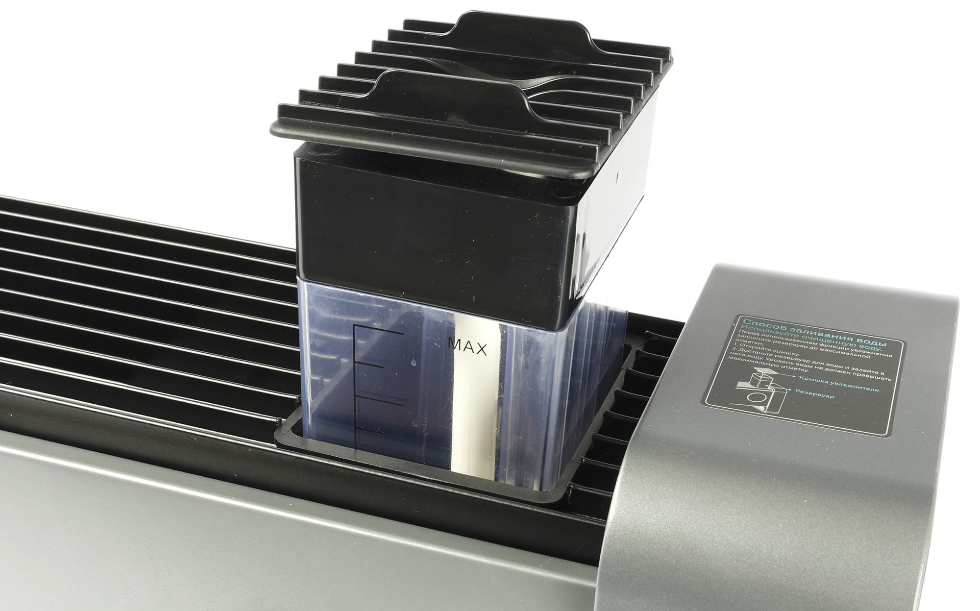 Бак для воды сделан из прозрачного пластика. На боковой стороне имеется градуировка, а также обозначение максимально допустимого уровня воды.