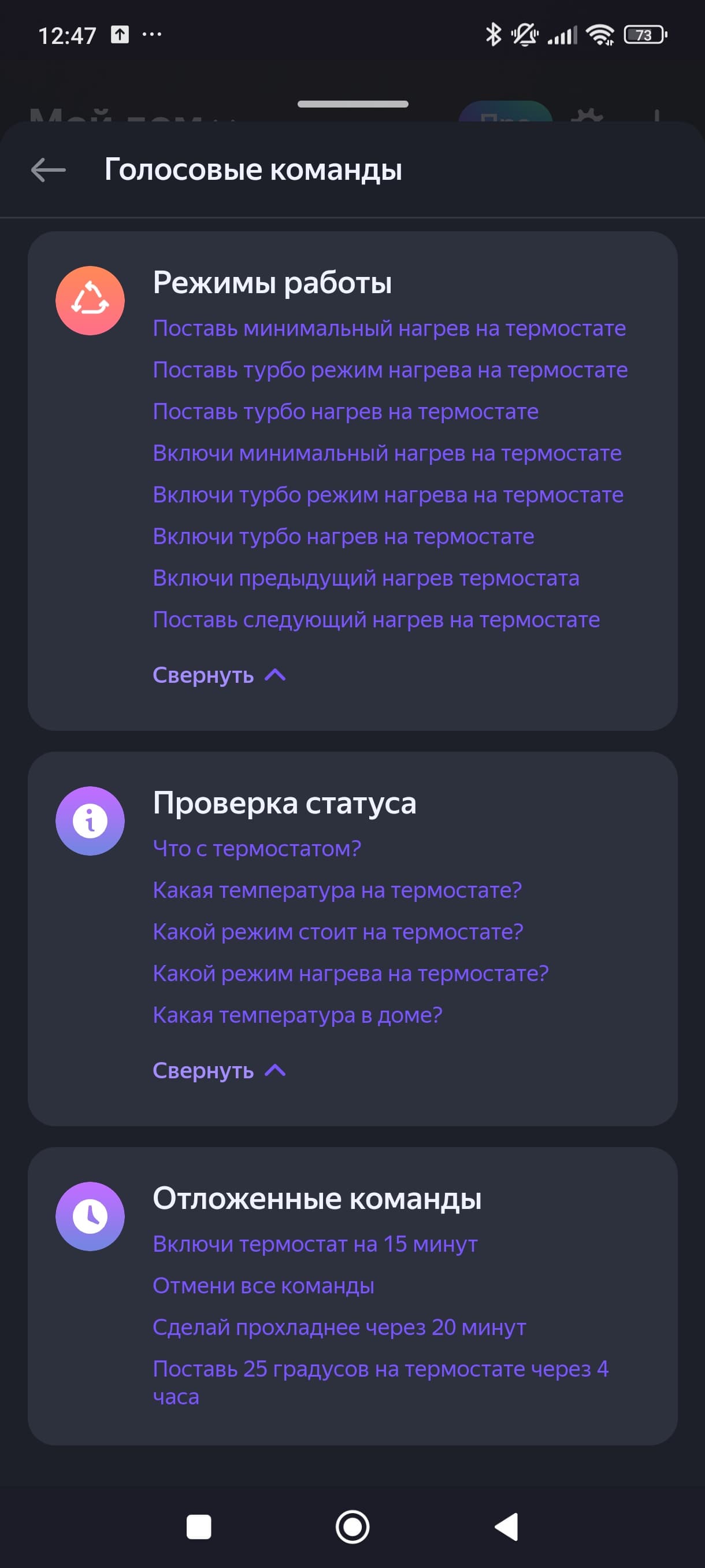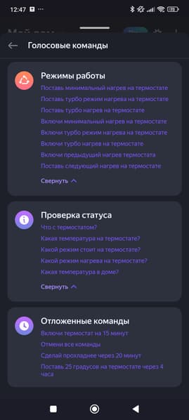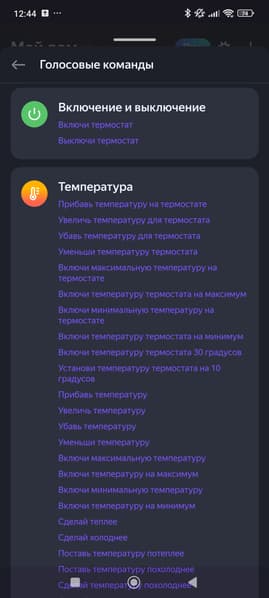 Список голосовых команд довольно стандартен. Отметим, что управления увлажнителем тут нет, а для указания целевой температуры придется сначала переключить режим работы на Эко (вручную или голосом).