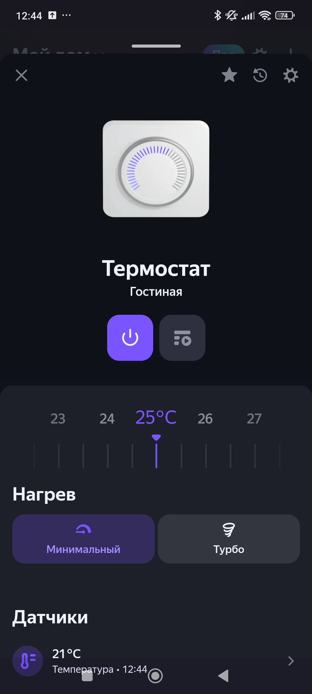 На главной странице мы видим небольшой пульт управления, на котором мы можем выбрать режим работы и целевую температуру.