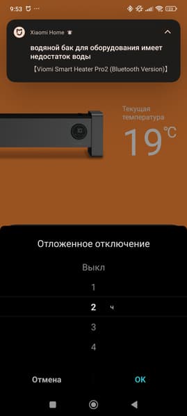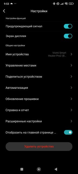 Уведомления о ключевых событиях приходят в шторку сообщений. Раздел настроек позволит отключить звуковые сигналы и экран дисплея на устройством. Остальные пункты касаются экосистемы Xiaomi Home и напрямую к управлению обогревателем не относятся.