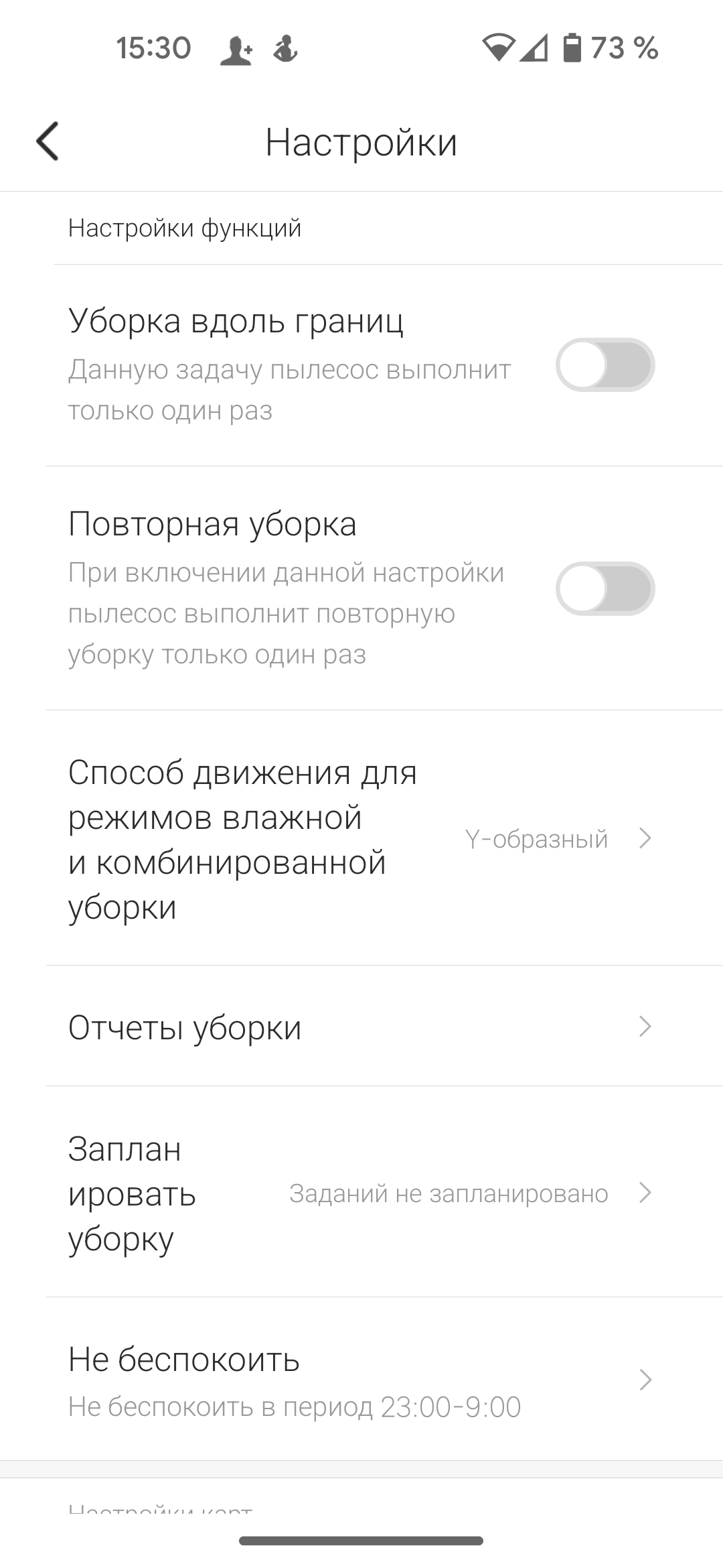 Раздел настроек предложит пользователю включить режим обхода периметра помещения или повторной уборки. Эти опции доступны для следующего запуска, а после окончания работы автоматически отключаются.
